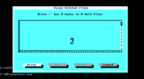 Рис. E.9. Окно восстановления файла программы UNERASE Выбрав кнопку "UnErase ", можно восстановить файл. Появится вспомогательное окно с именем файла и приглашением нажать первую букву имени файла. Необходимо ввести букву и нажать клавишу Enter . Если же вместо этого нажать Esc , то файл восстановлен не будет. Можно также восстановить несколько удаленных файлов. Для этого необходимо их выделить клавишей " Пробел ", затем нажать кнопку " UnErase ". Появится диалоговое окно, в котором запрашивается, надо ли делать запросы о первой букве файла. - Нажатие "Enter " - приступить к восстановлению файлов с запросом первой буквы файла. - Нажатие "Пробел " и "Enter " - приступить к восстановлению файлов без предварительного запроса первой буквы (программа Unerase будет подставлять в имена файлов букву a, b и т.д.) - Нажатие "Esc " приведет к отмене восстановления файлов. Выход из программы unerase - все та же клавиша " Esc ". E.2.6.2.3. Программа SmartCan.Для реализации с помощью утилит Нортона режима "дежурного" удаления файлов (см. подраздел E.2.6.1.2.) в Norton Utilites for DOS v. 7.0 и старше существуют две утилиты: SmartCan и Erase Protect. Исходя из их описания, которое было у автора, он не понял особой разницы в принципе работы этих программ. Вероятно, это просто версии одного и того же разных групп программистов. Тем не менее автор опишет принцип работы обоих этих программ. Программа SmartCan создает в корневой директории защищаемого диска директорию. В эту директорию помещаются все удаленные командой del файлы. Это напоминает каталог "Sentry", созданной программой undelete. В отличие от этой программы, при запуске программы SmartCan появляется диалоговое окно с настройками. Формат этого окна следующий: