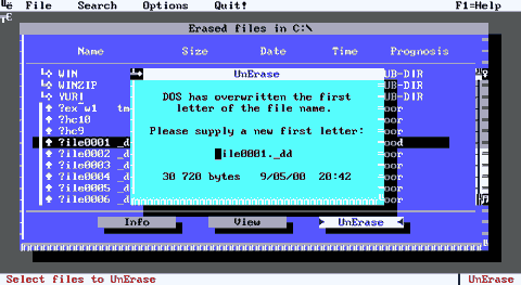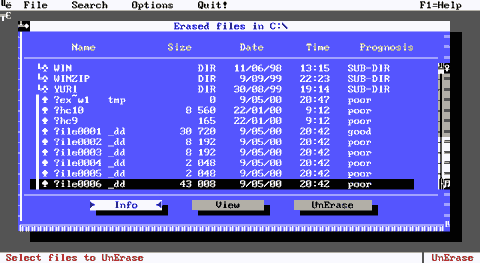 Стандартный режим восстановления файлов. Отличий от MS-DOS версии 5.0 нет. Дополнительные ключи команды UNDELETE MS-DOS v. 6.0. Появились следующие ключи: /STATUS - вызов на дисплей типа защиты от случайного удаления файлов на каждом диске. /LOAD - загрузка программы undelete в память с последующим ее использованием как резидентной. Программа использует установка файла undelete.ini. /UNLOAD - выгрузка резидентной части программы undelete из памяти. Файл undelete.ini содержит следующие разделы: "дежурные" диски; "дежурные" файлы; "зеркальные" диски; конфигурация; по-умолчанию. В разделе "дежурные" диски указаны диски, защищенных средствами "дежурного удаления", и приведена информация о них, а в разделе "зеркальные" диски - с использованием метода "поисковое удаление". В списке "дежурных" файлов приведен список всех файлов, защищаемых на диске. Наличие символа "-" указывает на исключение файла из списка сохраняемых. По-умолчанию не охраняются следующие файлы: *.tmp, *.vm?, *.woa, *.swp, *.spl, *.rmg, *.img, *.thm, *.dov В разделе "конфигурация" для пользователя важны следующие пункты: - Сохранение "архивных" файлов (со сброшенным атрибутом "архивный"). По-умолчанию - нет. Ключ: archive=FALSE; - Число дней, в течение которых будет сохраняться информация о файлах. По умолчанию - семь дней. Ключ: days=7; В разделе [defaults] ("по-умолчанию") приводится метод защиты каждого из дисков, принятый по-умолчанию. После формирования файла undelete.ini (который, при его отсутствии, создаст сама система) командой undelete /LOAD можно запустить систему отслеживания удаленных файлов. В памяти резидентная часть программы undelete занимает 13,5 Кбайт. E.2.6.2. Восстановление файлов средствами Norton Utilites.E.2.6.2.1. Программа quick unerase (qu).В комплекте Norton Utilites for DOS 4.5 для восстановления удаленных файлов имеется программа quick unerase (qu). Формат этой команды: qu [<диск>:][\<путь>\][\<имя_файла>] Команда не содержит опций. Она эквивалентна программе undelete MS-DOS версии 5.0 в стандартном режиме восстановления файлов. Работа команды. Программа qu, запущенная без параметров, будет предъявлять имена файлов, которые еще можно восстановить. Вместо первого символа будет указан символ "?". Далее выводится надпись: Do you wish to quick unerase file (Y/N)? (Хотите ли Вы восстановить этот файл (Y-Да/N-Нет)?) Если Вы не хотите восстанавливать файл, нажмите клавишу N. Иначе нажмите Y. В этом случае программа попросит ввести первый символ восстанавливаемого файла. После ввода этого символа файл восстановится. Примечание. Программу qu желательно использовать для версий MS-DOS вплоть до 5.0. В этих операционных системах нет собственных средств восстановления файлов, и программа qu может пригодиться. Для более старших версий DOS используйте команду undelete, поставляемую вместе с операционной системой, или команду unerase из пакета Norton Utilites for DOS v. 6.0 и старше, а также Norton Utilites for Win32 версий 2.5 и старше. E.2.6.2.2. Команда unerase пакета Norton Utilites.Программа unerase предназначена для восстановления файлов в MS-DOS или режиме эмуляции MS-DOS программ Microsoft Windows 95/98. Программа восстанавливает файлы в разделах FAT12, FAT16 и FAT32 (Norton Utilites for Win32 v. 3.01 и старше). Программа работает в собственной псевдографической оболочке. Вызов команды unerase: unerase [<диск>:][\<путь>\][\<имя_файла>] Смысл ее параметров - тот же, что и в команде undelete. Программа не имеет опций, и восстанавливает файлы в стандартном режиме восстановления. Если запускать программу без параметров, то она будет работать в диалоговом режи