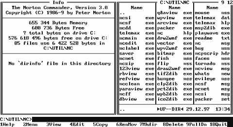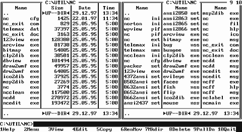 F.1.2.1.2. Полный формат показа оглавления каталога. F.1.2.1.3. Строка статуса панели. F.1.2.1.4. Размеры панелей. F.1.2.3. Просмотр информации о диске. F.1.2.4. Режим быстрого просмотра файлов. F.1.2.5. Управление отображением панелей. F.1.2.6. Паспорт каталога. F.1.2.7. Вывод архива. F.1.2.8. Вывод результата поиска. F.1.1. Просмотр содержимого каталогов в Norton Commander 3.0.Просмотр каталогов в оболочке Norton Commander осуществляется в экранных панелях (смотри раздел F.1.) Эта оболочка является прототипом для других оболочек, поэтому остановимся на ней по-подробнее. Работа в оболочке Norton Commander осуществляется путем подачи команд. Команды можно подавать: 1. В командной строке (как в DOS.) 2. С помощью меню. 3. С помощью клавиш-акселераторов. 4. С помощью мыши. Иногда после подачи команды появляется диалоговое окно, уточняющее ее смысл (если команда подавалась согласно пунктам 2, 3 и 4.) Согласно классификации элементов графического интерфейса, панель Norton Commander представляет собой окно-список (Listbox), однако некоторые операции с этим окном переопределены. В частности: 1. Для включения файла в выделенную группу, а также для исключения файла из группы с помощью мыши необходимо выбрать файл правой кнопкой мыши, а не использовать комбинацию клавиш Ctrl+<левая_клавиша_мыши> (или Shift+<левая_клавиша_мыши>). 2. Для включения файла в выделенную группу, а также для исключения файла из группы с помощью клавиатуры необходимо пользоваться клавишей <Insert> (а не Shift+<стрелка_вниз>). 3. Выбор левой клавишей мыши верхней части панели приводит к прокрутке содержимого панели вверх (аналог клавиши PgUp), а выбор нижней части панели -к прокрутке его содержимого вниз. 4. Щелчок мышью на верхней рамке панели открывает системное меню. 5. Выбор левой клавишей мыши кнопку мини-статуса эквивалентно нажатию соответствующей функциональной клавиши, а выбор правой кнопкой мыши-нажатию Shift+<функциональная_клавиша>. 6. Системное меню открывается клавишей F9 (а не F10 или Alt+<Пробел>, как в WIMP-интерфейсе). Так же как и в WIMP-интерфейсе, для перехода между панелями необходимо использовать клавишу <Tab> или выбрать левой клавишей мыши заголовок соседней панели. F.1.1.1. Вид панелей в оболочке Norton Commander.