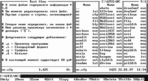 Рис. F.9. Просмотр файлов в панели Norton Commander 5.0. При быстром просмотре выполняемых файлов (*.com, *.exe) выдается информация о свойствах этого выполняемого файла и приглашение нажать Enter для запуска или F3 для его просмотра. При быстром просмотре графических файлов выдается информация, что эти файлы -графические и делается предложение просмотреть их в полноэкранном режиме. При быстром просмотре каталога выдается информация о числе файлов, подкаталогов в нем и общий размер всех файлов, файлов в подкаталогах и подкаталогов в просматриваемом каталоге. При этом отображается истинная длина файлов! (А не объем, занимаемый ими на диске.) Просмотр других зарегистрированных файлов (описанных в файле nc.cfg при установке Norton Commander) возможен с помощью внешних программ просмотра как в полноэкранном режиме, так и в режиме быстрого просмотра -на панели. Насколько знает автор, такой сервис не представляется ни одной другой Norton - подобной оболочкой. F.1.2.5. Управление отображением панелей.Отличий нет. F.1.2.6. Паспорт каталога.