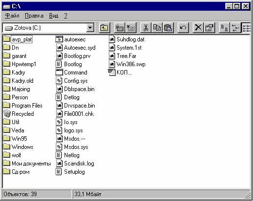 Рис. G.2. Вид менеджера файлов в операционной оболочке Microsoft Windows 3.11. Менеджер файлов Windows 3.11 представляет многоканальное приложение, дочерними окнами которого являются находящиеся на дисках компьютера особым образом представленные списки файлов и каталогов. Главное окно содержит прямоугольник заголовка с заголовком и манипуляторами, системное меню и строки состояния. В рабочей области главного окна содержатся дочерние окна, которые могут быть открытыми, распахнутыми во весь менеджер файлов или свернуты в икону. Только одно окно в менеджере файлов может быть активно; при этом информация о нем высвечивается в строке основания главного окна: она показывает количество свободного места на устройстве. Дочернее окно содержит прямоугольник заголовка вместе с заголовком и манипуляторами, панели управления, строки состояния и рабочей области. Рабочая область имеет две части, каждая из которых имеет свои полосы прокрутки: окно дерева каталогов и окно каталогов. Панель управления содержит на себе иконы дисков, подключенных в данный момент к компьютеру. Это может быть дисководы для дискет, разделы жесткого диска, сетевые диски, CD-ROM-проигрыватели, электронные диски (диски в памяти компьютера) и другие устройства. Каждое из них имеет свою икону. Выбор ее приводит к открытию дерева каталогов того устройства, на которое указывает икона. Панель управления в менеджере файлов, в отличие от панели управления в Microsoft Office, нельзя переместить. Строка состояния дочернего окна расположена сразу за панелью управления. Она показывает метку тома (метку диска на выбранном устройстве) и текущий путь к выбранному файлу. Запуск Менеджера Файлов осуществляется из группового окна Главные (Main) Менеджера программ Windows 3.11. Для открытия нового дочернего окна в менеджере файлов надо выбрать пункт Open (Открыть) пункта File системного меню. G.1.3. Просмотр файлов в Explorer оболочки Microsoft Windows 95/98/NT4.