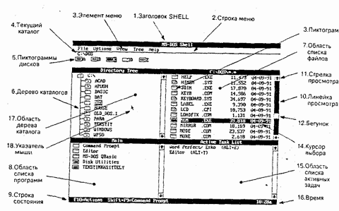 Рис. G.1. Вид основного окна оболочки DOS Shell. ВЫХОД И ВОЗВРАТ В SHELL Некоторые программы не работают под управлением интерфейса SHELL. Для их запуска необходимо выйти из этой оболочки. Существует два Способа выхода из MS-DOS SHELL, Если нужно временно покинуть SHELL для выполнения каких-либо действий с использованием командного режима DOS, то следует нажать клавиши Shift+F9 либо в списке программ Главной Группы (Main) выбрать Командный Режим (Command Prompt). На экране дисплея появляется текст: Microsoft (R) MS-DOS (R) Version 5.0 (С) Copyright Corp 1981- и символ готовности, например, С:\>. Для возврата в SHELL следует ввести команду EXIT. Возврат происходит в тот каталог, из которого был осуществлен выход из SHELL. Резидентные в памяти программы (TSR) следует запускать до ввода команды DOSSHELL. Например, команду PRINT необходимо вводить до запуска интерфейса SHELL 2. Если нужно окончательно выйти из SHELL и вернуться в командный режим DOS, то следует нажать функциональную клавишу F3. После этого на экране появляется символ готовности DOS (>) и программа SHELL удаляется из памяти, освобождая пространство размером 4,4 Кб. Аналогичный выход из SHELL осуществляется нажатием клавиш Alt+F4, либо выбором eXit (Выход) в меню File (Файл). Обратно к интерфейсу SHELL можно вернуться повторным его запуском командой DOSSHELL. ТЕРМИНОЛОГИЯ, ИСПОЛЬЗУЕМАЯ В SHELL После ввода команды DOSSHELL на экране появляется окно графического интерфейса Shell, пример которого показан на рис.-118. Графический интерфейс может работать в двух режимах: 1. Графический режим: в качестве указателя мыши используется стрелка, а место указания выбора каталога или файла обозначается пиктограммой в виде прямоугольника. 2. Текстовый режим: В качестве указателя мыши используется прямоугольник, а место указания выбора каталога обозначается квадратными скобками. Перед файлами такое место указания не предусмотрено. При описании графического интерфейса SHELL используется следующая терминология: 1. Заголовок SHELL: MS-DOS Shell 2. Строка меню (menu bar) 3. Элемент меню 4. Текущий каталог, например, C:\DOS 5. Пиктограммы дисководов (drive icons). Они различны для различных типов физических устройств: гибких дисков, жесткого диска и псевдодиска. Если компьютер подключен к сети, то появляется надпись NET. Имеют свои отметки также и логические дисководы, создание в результате выполнения команды SUBST. 6. Дерево каталогов (Directory Tree). Если какой-либо каталог содержит подкаталоги нижнего уровня, то он помечается символом +>>. При входе в подкаталог нижнего уровня он помечается символом -. Например, в дереве каталогов, показанном на рис.???, подкаталоги имеются в каталогах ACAD, APUOH и др. 7. Область списка файлов, в верхней части которой указан каталог, содержащий эти файлы. 8. Область списка программ (на рисунке показана Главная Группа). 9. Строка состояния в нижней части экрана. В этой строке выводятся быстрые клавиши, сообщения Shell и текущее время, например, 10:28а. 10. Линейка просмотра (Scroll Bar) располагается по краям областей. 11. На концах линейки просмотра имеются стрелки просмотра (Scroll Arrow). Они используются для прокрутки информации. 12. При прокрутке информации по линейке просмотра перемещается бегунок (Scroll Box). 13. Пиктограмма (иконка). 14. Курсор выбора. 15. Область списка активных программ. 16. Время, например, 10:28а. а до полудня, р после полудня. 17. Область дерева каталогов. Для просмотра каталогов можно пользоваться линейкой просмотра, располо