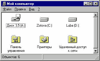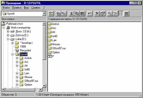 Рис. G.4. Проводник Windows 95. Проводник Windows'95 представляет из себя стандартную программу - файловую оболочку в Windows'95. В отличие от менеджера файлов Windows 3.11 она однооконная, то есть у ней есть только одно главное окно. Проводник Windows'95 состоит из Прямоугольника заголовка окна, куда включены все элементы перекрывающегося окна Windows'95, системного меню, непередвигаемой панели управления, рабочей области окна и строки состояния, расположенной внизу окна и показывающей число файлов в каталоге, длину выделенного файла и свободное место на диске. Рабочая область проводника Windows'95 состоит из 2-х областей - дерева папок и устройств и списка содержимого текущей папки. Эти области разделены вертикальной серой линией; ее можно переместить мышью, изменив, таким образом, размер любой из областей. В отличие от дерева каталогов в Менеджере файлов Windows 3.11, дерево Проводника Windows'95 начинается с иконы “Рабочий стол” и включает, кроме папок, и расположенные на компьютере устройства. Общий вид дерева Проводника следующий. а) Начинается дерево с объекта “Рабочий стол”, элементами которого служат объекты на рабочем столе Windows'95. б) Следующей ветвью открытого дерева является объект “Мой компьютер”, в качестве ветвей (обычно закрытых) в него входят подключенные к компьютеру дисководы для дискет, логические диски компьютер, CD-ROM дисководы, сетевые диски, другие дисковые устройства. Кроме того, всегда содержатся папки “Панель управления”, задающая режимы работы компьютера, “Принтеры”, которые содержат список всех установленных драйверов принтеров на компьютере, а также позволяет удалять старые и устанавливать новые драйверы, и “Удаленный доступ к сети”, управляющая соединением с помощью модема. Окно содержимого текущей папкианалогично окну каталога в Менеджере файлов, но число иконок в обозначении документов больше. Дело в том, что каждому запускаемому под Windows'95 приложению соответствует одно или несколько открываемых по умолчанию типов файлов (с разным расширением, имеющих свою кнопку. Эта икона и отображается слева от названия документа. Переключение между окнами дерева папок и содержимого папки осуществляется либо мышью, либо с помощью клавиши Tab. Вообще в остальном работа с проводником аналогична работе с Менеджером Файлов Windows 3.11 (то же дерево каталогов и тот же объект - список файлов, работа которых уже описана). В проводнике Windows 98, как и в программе Explorer для нее, существует опция показа “как Web-страница”. В случае ее установки в проводнике появляется третья область - область показа свойств объекта. Вид и назначение этой области такое же, как и в Explorer. G.1.5. Какие различия в организации работы с файлами есть в Windows 95?В Windows 95 есть два способа организации работы с файлами: с помощью графического интерфейса, как в OS/2, и с помощью файловых оболочек, как в Windows 3.11. Оба эти способа не противопоставляются, а дополняют друг друга. При открытии любого объекта на рабочем столе (устройстве, папки) появляется его содержимое в виде списка содержащихся в нем объекте. Эти объекты также можно открыть. В опциях объектов можно указать, происходит ли при открытии нового объекта открытие нового окна или его содержимое помещается в уже открытое (пункт меню Свойства подменю Вид). Любое меню объекта, кроме рамки с заголовком, имеет меню, и (возможно) панель управления и строку 