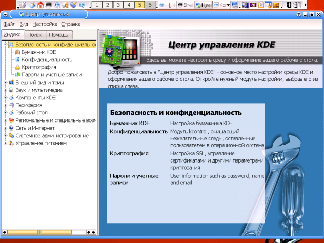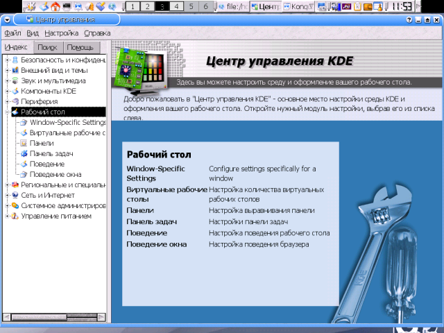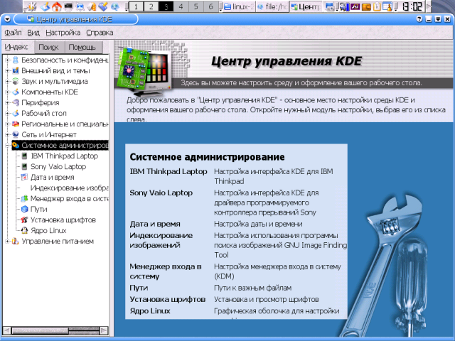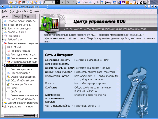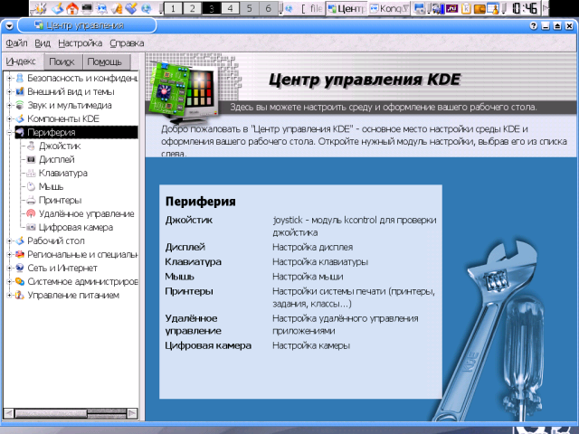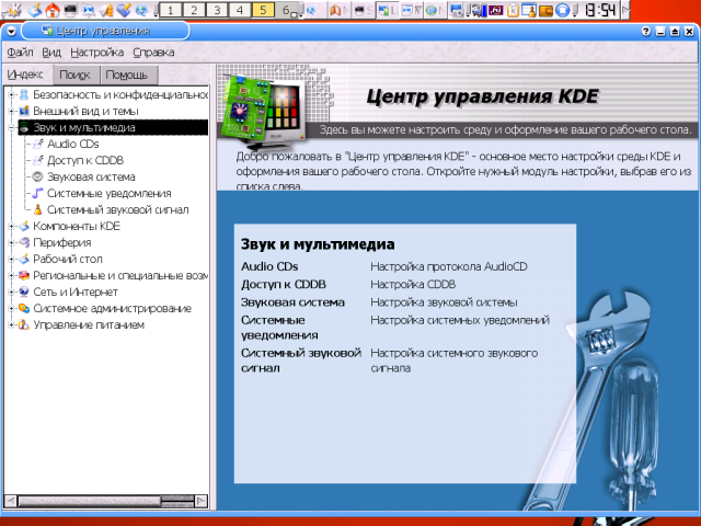 Еще два пакета я также ставлю всегда - это Осталось упомянуть пакеты, которые я никогда не ставлю и потому о содержании коих имею смутное представление: УстановкаВ большинстве случаев пользователю не приходится как-то по особенному озабочиваться установкой KDE - с этой задачей справляется либо инсталлятор его дистрибутива, либо штатная система управления пакетами. Некоторая проблема возникает только в том случае, если предлагаемая схема установки почему-либо не устраивает, например, вследствие заведомой избыточности: я уже отмечал, что ряд пакетов из набора KDE практического смысла для большинства пользователей не имеет. И тут может оказаться целесообразным прибегнуть к ручной сборке требуемых компонентов. Сам по себе процесс сборки KDE также особых сложностей не представляет - нужно только выдерживать последовательность сборки пакетов: сначала собирается библиотека Qt, потому звуковая система Для сборки библиотеки Qt тарбалл ее исходников распаковывается в тот каталог, в котором мы хотим ее видеть в дальнейшем - по умолчанию это $ mv qt-version qt А в профильный файл командной оболочки - общесистемный или пользовательский, то есть root'овый, - внести коррективы в значения переменных описания путей (подробно это описано в сопроводительной документации). Для sh-совместимого семейства это выглядит примерно так: QTDIR=/usr/local/qt PATH=$QTDIR/bin:$PATH MANPATH=$QTDIR/man:$MANPATH LD_LIBRARY_PATH=$QTDIR/lib:$LD_LIBRARY_PATH export QTDIR PATH MANPATH LD_LIBRARY_PATH А в C-shell (и setenv QTDIR /usr/local/qt setenv PATH $QTDIR/bin:$PATH setenv MANPATH $QTDIR/doc/man:$MANPATH setenv LD_LIBRARY_PATH $QTDIR/lib:$LD_LIBRARY_PATH Эти переменные потребуются уже на стадии конфигурирования/компиляции, поэтому необходимо либо авторизоваться заново, либо перечитать профильный файл предусмотренным образом (например, через $ ./configure && make - и Qt можно считать установленной. По умолчанию бинарники библиотеки собираются в тот же каталог, что и исходники, так что необходимости в команде Из остальных опций конфигурирования не лишней представляется минимум одна - Интересно, что при сборке Qt игнорируются любые флаги Сборка каждого из пакетов собственно KDE выполняется посредством трех традиционных сакральных действ - $ ./configure && make && make install из которых особого внимания заслуживает первое. Особенность конфигурационных сценариев пакетов KDE в том, что они обычно исполняются до конца - даже в случае нарушения зависимостей. о каковых по отработке скприта выдается полный отчет. При этом четко различаются зависимости "жесткие", без которых сборка и функционирование пакета невозможны, и "мягкие" зависимости, добавляющие ему необязательных (но часто задействованных по умолчанию) функций. Если с "жесткими" зависимостями все ясно - они подлежат непременному удовлетворению, - то в отношении зависимостей "мягких" пользователю предоставляется выбор. Наприме, в числе "мягких" зависимостей пакетов KDE обнаруживаются система печати $ ./configure --help По умолчанию Qt и пакеты KDE устанавливаются в собственные ветки каталога $ ./configure --prefix=/opt --with-qt-dir=/opt/qt После сборки Qt и /opt/qt/lib /opt/kde/lib и запустить команду $ ldconfig Теперь об оптимизации. KDE (как и Qt) написана на Си++, и, соответственно для оптимизации требуется не флаг export CXXFLAGS="$CFLAGS" Ну, а о возможных значениях Собственные средства настройкиНастройка KDE - процесс многогранный. С одной стороны, пользователь может использовать этот десктоп в его умолчальном виде, с другой - затратить массу 