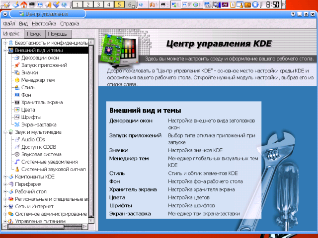 Программа Внешний вид и темыЭто - очень обширный пункт меню (рис. 3), через который можно настроить практически все визуальные элементы интерфейса KDE, как то: