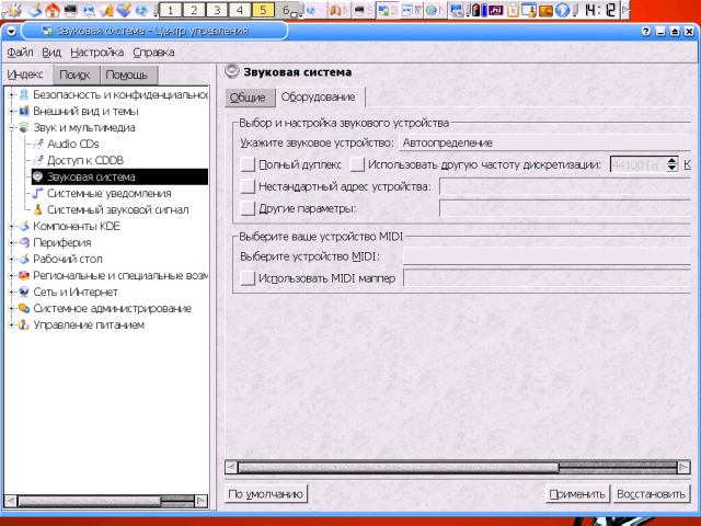 Назначение элементов более или менее понятно из их имен. К сожалению, иерархия их несколько запутана, что усугубляется русским переводом соответствующих подпунктов меню. Поэтому здесь можно говорить или очень много, или ничего (в рассчете, что пользователь со временем сам во всем разберется). Для начала замечу только, что здесь определяются такие визуальные свойства KDE, как пиктограммы управления окнами, цвет и фоновый рисунок рабочего стола, гарнитуры, размер и цвет глобально используемых шрифтов и многое, многое другое. Главным подпунктом этого меню является Менеджер тем: именно выбор темы определяет характер всех интерфейсных элементов. Однако большинство из них могут после этого быть настроены независимо - с помощью остальных пунктов. Правда, никаких тем (кроме той, что подразумевается по умолчанию), в комплекте KDE и нет. Их нужно отыскать (например, на упоминавшемся ранее сайте http://kde-look.org) и установить самостоятельно. Далее эту тему можно распространить либо на все интерфейсные элементы, либо лишь на некоторые (стиль, например, декорации окон или пиктограммы). Каковых, впрочем, немало имеется и в штатной теме по умолчанию. В общем, все это легче понять, попробовав что-то изменить, чем внятно описать, как и что именно следует менять (тем более, что у каждого будут собственные предпочтения). Звук и мультимедиаВ этом пункте (рис. 4) можно настроить параметры воспроизведения аудио-компактов и доступа к базе данных оных в Сети, изменить характер системных сообщений в ответ на всякого рода события и, конечно же, сконфигурировать собственно систему воспроизведения звука. Почти все это - интуитивно понятно, только последний пункт заслуживает пары слов.