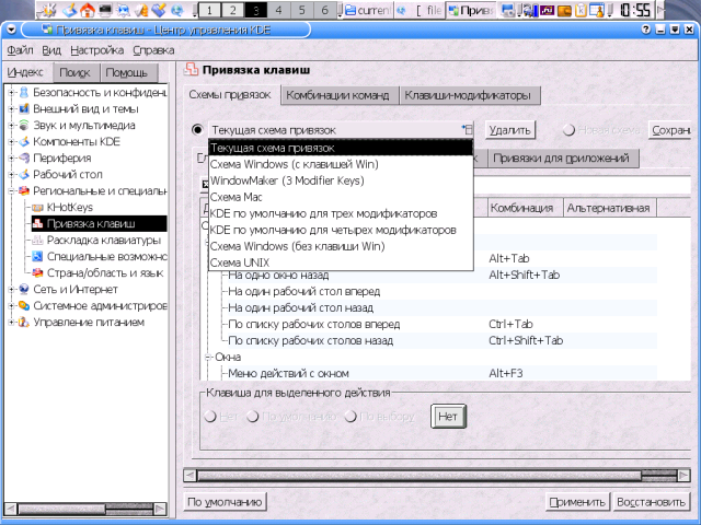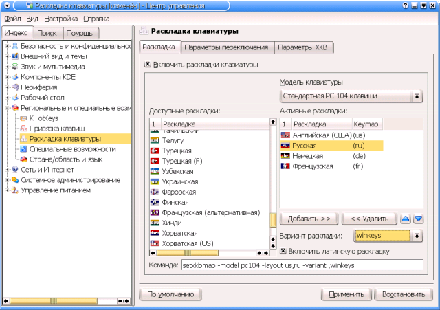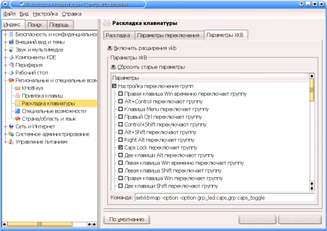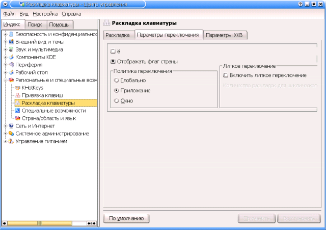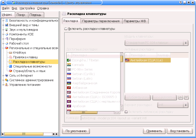 Теоретически тут присутствует и вкладка Настройка ACPI, однако на моей Toshiba ее стандартные опции оказались недоступными, а попытка включить дополнительные опции вызвала грозное предупреждение, коему я счел за благо внять. Конфигурационные файлыИнтерактивные настройки через Центр управления KDE, естественно, находят свое отражение в соответствующих конфигурационных файлах. И настало время рассмотреть, хотя бы вкратце, их структуру. Общесистемные конфиги KDE собраны в подкаталоге Ну а пользовательские настройки KDE, как всегда, определяются rc-файлами в домашнем каталоге каждого пользователя. Тут в первую голову следует упомянуть основной конфигурационный файл - Далее, некоторое отношение к конфигурации KDE имеет каталог $HOME/.fonts - именно в нем, как уже говорилось, помещаются шрифты, устанавливаемые через Центр управления обычным пользователем.Главные же настройки KDE сосредоточены в каталоге В ближайших заметках представление об этих файлах понадобится нам а) для корректной настройки клавиатурных раскладок KDE, и б) для индивидуального конфигурирования некоторых KDE-приложений. Детали настройки клавиатурыНастройка клавиатуры - благо и проклятие начинающего пользователя KDE. Благо - потому, что возможности этой среды по управлению клавиатурными раскладками существенно превосходят базовые функции, предоставляемые самой оконной системой Икс. Проклятием же это дело может показаться в том случае, если пользователь, впервые берущийся за KDE и выполнивший все формально предписанные по штату действия, вдруг с удивлением обнаруживает, что он не только не получил тех самых дополнительных возможностей, но и утратил способность переключаться с латиницы на кириллицу (или, что еще хуже, наоборот - с кириллицы на латиницу) вообще. Тем не менее, все не так страшно, как может показаться на первый взгляд. И если ранее (например, в руководствах Алексея Новодворского к первым версиям Mandrake Russian Edition) резонные люди советовали вообще не трогать модуль настройки клавиатуры KDE, во избежание потери базовой русификации Иксов, то ныне им вполне можно пользоваться. Если это, конечно, нужно. А нужно ли это народу? Как обычно, ответ будет вполне дипломатичный - кому нужно, а кому и нет. В обоснование чего вспомним, как достигается базовая русификация клавиатуры в Иксах и что она дает. Как явствует из главы 16, сами по себе Иксы (то есть X-сервер) обеспечивают пользователю подключение кириллической раскладки, и не более того. Причем раскладки - одной единственной, примерно соответствующей фабрично русифицированным клавиатурам с DOS-маркировкой клавиш. Что не следует путать с DOS-кодировкой клавиатурного ввода - это название исторически закрепилось за некогда распространенными (а когда-то и единственно наличествующими) в продаже клавиатурами, у которых в кириллице самые востребованные знаки препинания (точка и запятая) располагались на верхнем регистре цифрового ряда клавиш - как на механических пишущих машинках отечественного (и соцлагерного) производства... Далее, Иксы, позволяя подключить кириллическую раскладку, парадоксальным способом не обеспечивают возможности переключения на нее (или, напротив, с нее на латиницу). Ибо эта самая кириллическая раскладка штатно такого переключателя не содержит. Историческое отступление: некогда русская раскладка переключател
