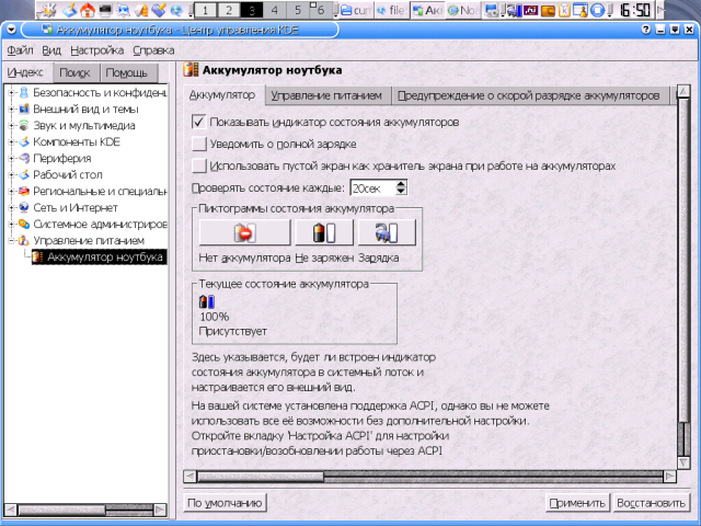 Лирическое отступление. Ряд моих знакомых, отбывших в забугорье в поисках лучшей жизни и работающие в тамошних университетах, время от времени пишут мне письма. На русском языке, разумеется (письма на английском от соотечественников, хотя бы и бывших, я не читаю принципиально), но, как правило, латиницей. Что мотивируется тем, что, работая на Unix-машинах, они не имеют административных прав и, соответственно, возможности установить русские шрифты. Так вот, KDE с помощью модуля И еще. Я этого не пробовал, но, теоретически рассуждая, не вижу причин, почему бы благородному зарубежному дону и сам KDE не установить как обычному пользователю в свой домашний каталог, причем, скорее всего, под любым проприетарным Unix'ом, использующим любой коммерческий X-сервер. И в дальнейшем запускать его в качестве десктопа по умолчанию - для этого потребуется только внести соответствующие коррективы в файл Управление питаниемЭтот раздел содержит единственный пункт - Аккумулятор ноутбука и, соответственно, только для ноутбуков и предназначен. Здесь можно настроить довольно много вещей - от вида пиктограмм-индикаторов зарядки/разрядки аккумулятора до времени предупреждения о скорой/критичной разрядке и соответствующих им действий (исполнение команд, подача звукового сигнала).