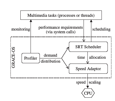 2.14. GRACE-OS</a)Система GRACE-OS представляет собой планировщик CPU в режиме мягкого реального времени для мобильных устройств, выполняющих, главным образом, мультимедийные приложения [YN03]. Система GRACE-OS разработана в Иллинойском университете (University of Illinois, Department of Computer Science). При проектировании системы первоочередными целями ставились задачи поддержки качества сервиса и сбережения энергии. Для достижения поставленных целей GRACE-OS интегрирует динамическое масштабирование напряжения в диспетчеризацию на основе модели мягкого реального времени и определяет, как быстро, когда и как долго должно осуществляться выполнение приложений. Планировщик GRACE-OS реализован внутри ядра Linux, и апробирован на лэптопе HP Pavilion. Планировщик GRACE-OS состоит из трех основных компонентов – профайлера, планировщика SRT (soft real-time) и адаптера скорости, как показано на рис. 12.