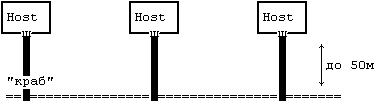 Толстый Ethernet. 15 пиновый коннектор со стороны hosta. "Краб" - для подключения к основному кабелю. На концах - N-терминаторы.(L<= 500м) |