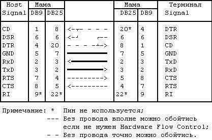 Host/DTE(9мама) >---< Терминал/DCE(25мама)