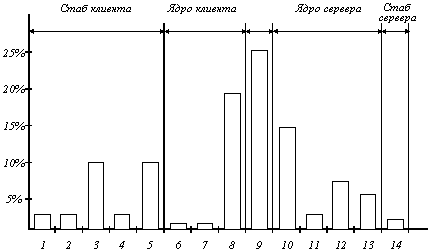 ![]() Рис. 3.2. Remote Procedure Call Когда ядро получает управление, оно переключает контексты, сохраняет регистры процессора и карту памяти (дескрипторы страниц), устанавливает новую карту памяти, которая будет использоваться для работы в режиме ядра. Поскольку контексты ядра и пользователя различаются, ядро должно точно скопировать сообщение в свое собственное адресное пространство, так, чтобы иметь к нему доступ, запомнить адрес назначения (а, возможно, и другие поля заголовка), а также оно должно передать его сетевому интерфейсу. На этом завершается работа на клиентской стороне. Включается таймер передачи, и ядро может либо выполнять циклический опрос наличия ответа, либо передать управление планировщику, который выберет какой-либо другой процесс на выполнение. В первом случае ускоряется выполнение запроса, но отсутствует мультипрограммирование. На стороне сервера поступающие биты помещаются принимающей аппаратурой либо во встроенный буфер, либо в оперативную память. Когда вся информация будет получена, генерируется прерывание. Обработчик прерывания проверяет правильность данных пакета и определяет, какому стабу следует их передать. Если ни один из стабов не ожидает этот пакет, обработчик должен либо поместить его в буфер, либо вообще отказаться от него. Если имеется ожидающий стаб, то сообщение копируется ему. Наконец, выполняется переключение контекстов, в результате чего восстанавливаются регистры и карта памяти, принимая те значения, которые они имели в момент, когда стаб сделал вызов receive. Теперь начинает работу серверный стаб. Он распаковывает параметры и помещает их соответствующим образом в стек. Когда все готово, выполняется вызов сервера. После выполнения процедуры сервер передает результаты клиенту. Для этого выполняются все описанные выше этапы, только в обратном порядке. Рисунок 3.3 показывает последовательность команд, которую необходимо выполнить для каждого RPC-вызова, а рисунок 3.4 - какая доля общего времени выполнения RPC тратится на выполнение каждого их описанных 14 этапов. Исследования были проведены на мультипроцессорной рабочей станции DEC Firefly, и, хотя наличие пяти процессоров обязательно повлияло на результаты измерений, приведенная на рисунке гистограмма дает общее представление о процессе выполнения RPC.