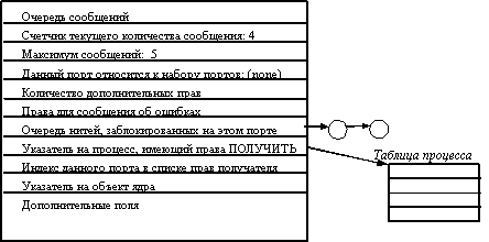Коммуникации в ядре MachОсновной целью, которую ставили перед собой разработчики средств коммуникации ядра Mach, являлась поддержка различных стилей коммуникаций в сочетании с надежностью и гибкостью. Коммуникационные средства ядра Mach могут поддерживать асинхронную передачу сообщений, RPC, потоки байт (streams), а также другие способы. Механизм взаимодействия процессов Mach базируется на соответствующих механизмах своих предшественников - RIG и Accent. Из-за своего эволюционного развития этот механизм приспособлен больше для локального использования, а не для распределенных систем. Сначала рассмотрим случай одного узла, а затем расширим его для сети. Следует отметить, что мультипроцессор - это тоже один узел, поэтому взаимодействие процессов, работающих на разных процессорах многопроцессорной машины, также относится к локальному случаю. ПортыОсновой всех коммуникаций в Mach является структура данных ядра, называемая порт. В сущности порт представляет собой защищенный почтовый ящик. Когда нить одного процесса хочет взаимодействовать с нитью другого процесса, то нить-отправитель записывает сообщение в такой порт, а нить-получатель извлекает его оттуда. Каждый порт имеет средства защиты, которые гарантируют, что только процессы, имеющие соответствующие права, могут передавать и получать через него сообщения. Порт поддерживает взаимодействие подобно конвейерам (pipes) в UNIX. Порт, который может быть использован для отправки запроса от клиента серверу, не может использоваться для отправки ответа от сервера клиенту. Для этого нужен второй порт. У каждого порта может быть только один процесс, читающий из него сообщения, и несколько процессов, пишущих в порт. Порты поддерживают надежный и последовательный обмен сообщениями. Если нить посылает сообщения в порт, то система гарантирует, что оно будет доставлено. Сообщения никогда не теряются из-за ошибок, переполнения или других причин (по крайней мере, если нет отказов аппаратуры). Также гарантируется, что сообщения, отправленные одной нитью, будут получены в том же порядке. Если же две нити пишут в один и тот же порт попеременно, то система не дает никаких гарантий о последовательности сообщений, так как в ядре сообщения буферизуются. В отличие от конвейера, порты поддерживают поток не байтов, а сообщений. Несколько сообщений никогда не соединяются вместе в одно сообщение. Структура порта показана на рисунке 6.8.