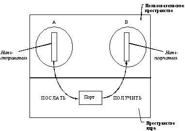 ![]() Рис 6.8. Структура порта Когда порт создается, выделяется 64 байта из пространства ядра и они используются до тех пор, пока порт не разрушен, либо явно, либо косвенно, при определенных обстоятельствах, например, когда не окажется в наличии ни одного процесса, который использует этот порт. Порт содержит поля, указанные на рисунке 6.8, а также еще несколько второстепенных. Сами сообщения хранятся не в порте, а в другой структуре данных ядра, называемой очередь сообщений. Порт содержит счетчик, в котором хранится текущее количество сообщений, находящихся в очереди, и максимально возможное число сообщений в очереди. Если порт относится к какому-либо набору портов, то порт хранит указатель на структуру данных набора портов. Как уже было кратко упомянуто выше, процесс может предоставить другим процессам права на использование его портов. По различным причинам ядро должно знать, сколько прав каждого типа предоставлено, поэтому порт хранит их количество. Если при использовании порта возникает ошибка, то о ней сообщается путем посылки сообщений на другие порты, чьи права хранятся здесь. Нити могут быть заблокированы при чтении из порта, поэтому в структуру порта включен указатель на список заблокированных нитей. Также важна возможность нахождения прав на чтение из порта (он может быть только один), поэтому такая информация тоже хранится в структуре данных порта. Если порт представляет собой порт процесса, то следующее поле содержит указатель на процесс, к которому порт относится. Если это порт нити, то это поле содержит указатель на структуру данных ядра для нити, и так далее. Имеется также несколько дополнительных полей, не описанных здесь. Когда нить создает порт, то в ответ она получает целое число, идентифицирующее порт, аналогичное дескриптору файла в UNIX. Это число используется в последовательных вызовах, с помощью которых посылаются сообщения порту или принимаются сообщения от него, для того, чтобы идентифицировать, какой порт нужно использовать. Порты хранятся для процессов, а не для нитей, так что если одна нить создает порт и получает в ответ идентификатор 3, то другая нить того же процесса никогда не получит этот идентификатор при создании порта. Фактически ядро не запоминает информацию о том, какая нить какой порт создала. Нить может передать права доступа к порту другой нити другого процесса. Ясно, что нельзя проделать это просто помещением соответствующего целого числа в сообщение, так же как и UNIX-процесс не может передать дескриптор файла для стандартного устройства вывода путем записи 1 в конвейер. Используемый для этого механизм защищен ядром, мы обсудим его позже. В данный момент времени важно только знать, что это можно сделать. На рисунке 6.9 мы видим ситуацию, в которой два процесса, А и В, имеют доступ к одному и тому же порту. Процесс А послал сообщение для данного порта, а процесс В прочитал это сообщение. Заголовок и тело сообщения физически копируются из А в порт, а затем из порта в В.