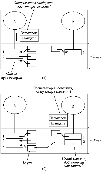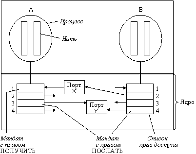 ![]() Рис. 6.9. Передача сообщений через порт Для удобства порты можно группировать в наборы портов. Порт может относится максимум к одному набору портов. Можно произвести операцию чтения из набора портов (но записать сообщение можно только в один порт). Например, сервер может использовать этот механизм для одновременного чтения из большого количества портов. Ядро возвращает одно сообщение от одного порта набора. В отношении того, какой порт будет выбран, не дается никаких обещаний. Если все порты пусты, то сервер блокируется. В этом случае сервер может поддерживать разные порты для каждого из многих поддерживаемых им объектов и получать сообщения для каждого из них без необходимости выделять нить для каждого объекта. В соответствии с текущей реализацией все сообщения для набора портов ставятся в общую очередь, так что на практике нет особой разницы между получением из порта и получением из набора портов. Некоторые порты используются особым образом. Каждый процесс имеет специальный порт - порт процесса, который нужен для связи процесса с ядром. Большая часть "системных вызовов", связанных с процессами (смотрите табл. 6.1), делается путем посылки сообщения в этот порт. Аналогично, каждая нить имеет свой собственный порт для выполнения "системных вызовов", связанных с нитями. Взаимодействие с драйверами ввода-вывода также реализуется с использованием механизма портов. Права доступа В первом приближении, для каждого процесса ядро поддерживает таблицу всех портов, к которым он имеет доступ. Эта таблица хранится в ядре, так что пользовательский процесс не может получить к ней доступ. Процесс ссылается на порты, указывая номер их позиции в этой таблице, например, 1, 2 и так далее. Входы этой таблицы содержат указатели на порты и определяют разрешенные над ними действия, и называются мандатами. Назовем таблицу списком прав доступа (списком мандатов). Каждый процесс имеет ровно один список прав доступа. Когда нить обращается к ядру с запросом на создание для нее порта, ядро делает это и создает запись в таблице прав доступа того процесса, к которому относится данная нить. Вызывающая нить и все другие нити того же процесса имеют равные права доступа. Целое число, возвращаемое нити, чтобы идентифицировать права доступа, является обычно индексом в списке прав. Далее мы будем называть это целое число именем права доступа (именем мандата). Все нити одного процесса имеют равные права по доступу к портам процесса. Права определяются по отношению к трем возможным операциям: ПОЛУЧИТЬ, ПОСЛАТЬ и ПОСЛАТЬ-ОДИН-РАЗ. Право ПОЛУЧИТЬ дает возможность обладателю этого права прочитать сообщение из порта. Ранее упоминалось, что связи в Mach однонаправленные. Это означает, что в любой произвольный момент только один процесс может иметь право ПОЛУЧИТЬ для данного порта. Мандат с правом ПОЛУЧИТЬ можно передавать другому процессу, но это означает, что он будят изъят у исходного процесса. Таким образом, для каждого порта имеется только один потенциальный получатель. Мандат с правом ПОСЛАТЬ позволяет его владельцу отсылать сообщения определенному порту. Таким правом могут обладать многие процессы. Эта ситуация является грубым аналогом банковской системы во многих странах: каждый, кто знает номер банковского счета, может положить на него деньги, но только владел