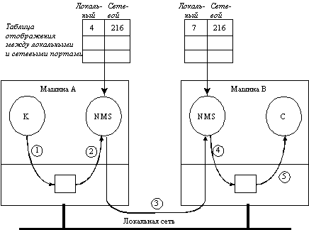 ![]() Рис. 6.14. Межмашинное взаимодействие в Mach выполняется за пять шагов Когда сервер сообщений удаленной сети получает сообщение, он берет из него номер сетевого порта и отображает его на номер локального порта. На шаге 4 сервер записывает сообщение в этот локальный порт. Наконец, локальный сервер машины В читает сообщение из локального порта и выполняет запрос клиента машины А. Ответ проходит по этому же пути в обратном направлении. Сложное сообщение требует небольшой дополнительной работы. Для обычных полей данных сервер сетевых сообщений на машине-сервере выполняет преобразование форматов данных, если это необходимо (например, изменяет порядок байт в слове). Обработка прав доступа при пересылке через сети также усложняется. Когда мандат пересылается через сеть, должен быть назначен номер сетевого порта, и оба сервера сетевых сообщений, отправитель и получатель, должны сделать соответствующие записи в своих таблицах отображения. Если эти машины не доверяют друг другу, необходимы тщательно разработанные процедуры аутентификации, чтобы каждая из машин убедилась в идентичности другой. Хотя механизм передачи сообщений от одной машины к другой через сервер пользовательского режима обладает гибкостью, за это платится высокая цена, выражающаяся в снижении производительности по сравнению с реализацией межмашинного взаимодействия полностью внутри ядра, как это делается в большинстве других распределенных систем.