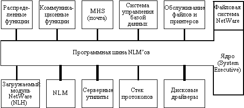![]() Рис. 7.1. Структура ОС NetWare Ядро системы, называемое System Executive, выполняет базовые задачи ОС по управлению памятью, планированию и диспетчированию нитей, управлению файловой системой, также поддерживает программную шину для интерфейса NLM'ов. Каждый NLM выполняет либо функции операционной системы (драйвер диска или сетевого адаптера, утилита пространства имен, файловый сервер или модуль почтового сервиса), либо является пользовательским модулем, реализующим дополнительный сетевой сервис - например, сервис SQL-сервера или сервера печати. Для ядра системы все модули NLM равноправны, поэтому расширение или сужение функций системы осуществляется путем добавления или выгрузки соответствующего NLM'а. Novell обеспечивает расширяемость системы NetWare за счет предоставления программистам набора инструментальных средств и строго описанных интерфейсов API для разработки собственных NLM-приложений, использующих все возможности 32-разрядного окружения. В настоящее время существует большое количество программных систем третьих фирм, реализованных в виде NLM-приложений, для серверов NetWare - серверы баз данных, коммуникационные серверы и т.п. Открытость ОС NetWare обеспечивается поддержкой ею наиболее популярных стеков протоколов в строгом соответствии с существующими стандартами. NetWare поддерживает такие популярные сетевые протоколы, как IPX/SPX, TCP/IP, Apple Talk, и средства их мультиплексирования, такие как STREAMS и TLI. Стандарт ODI позволяет независимым разработчикам сетевых адаптеров легко включать свои NLM-драйверы в состав серверной ОС NetWare. Кроме того, фирма Novell разработала для NetWare большое количество программных средств - шлюзов к другим широко распространенным сетям, таким, как сети Internet и SNA. Способы обеспечения надежностиВ системах NetWare предусмотрен ряд функций, обеспечивающих надежность системы и целостность данных. Ниже перечислены функции, которые обеспечивают защиту всех частей сервера: от устройств хранения данных до критичных файлов прикладных программ. Наличие таких функций позволяет NetWare обеспечить очень высокий уровень надежности сети. Средства обеспечения надежности SFT I: