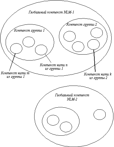 В среде NetWare различается три вида контекстов нитей: глобальный контекст, контекст группы нитей и контекст отдельной нити. Эти контексты вложены друг в друга, как это показано на рисунке 7.2. Соотношение между данными этих контекстов напоминает соотношение глобальных и локальных переменных в программе, написанной на языке C. Глобальный контекст является общим для всех нитей данного NLM'а, и все его переменные видны для всех его нитей. В NetWare можно создавать несколько групп нитей внутри одного NLM-процесса, и эти группы имеют свой групповой контекст. Все нити группы видят переменные контекста своей группы, но не видят переменных контекста другой группы. И, наконец, каждая отдельная нить имеет свой собственный контекст. Содержимое этого контекста доступно только для данной нити. Очевидно, что такая иерархическая организация контекстов ускоряет переключение нитей, так как при переключении с нити на нить в пределах одной группы нет необходимости заменять контексты групп или глобальные контексты, достаточно лишь заменить контексты нитей, которые меньше по объему, чем контексты других видов. Аналогично, при переключении с нити одной группы на нить другой группы в пределах одного NLM глобальный контекст не изменяется, а заменяется только контекст группы. Переключение же глобальных контекстов происходит только при переходе с нити одного NLM на нить другого NLM. Программный код в NetWare для работы с нитями может пользоваться различными библиотечными функциями, такими как: