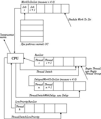Кроме этих функций NetWare предоставляет средства синхронизации нитей с помощью семафоров и сигналов. Планировщик NetWare использует несколько очередей для организации невытесняющей дисциплины обслуживания нитей (рисунок 7.3). При создании нити с помощью функций BeginThread или BeginThreadGroup нить попадает в конец очереди RunList, которая содержит готовые к выполнению нити. После того, как выполнявшаяся на CPU нить завершает свою очередную итерацию с помощью одного из вызовов передачи управления (или вызова ожидания на семафоре), планировщик выбирает для выполнения стоящую первой в очереди RunList нить и запускает ее на выполнение. Нить, завершившая свою очередную итерацию, помещается в конец одной из очередей в зависимости от того, какой вызов передачи управления она использовала: в конец очереди RunList при вызове ThreadSwitch, в конец очереди DelayedWorkToDoList при вызовах ThreadSwitchWithDelay или Delay или же в конец очереди LowPriorityRunList при вызове ThreadSwitchLowPriority. Если же нить вообще завершила свою работу, выполнив функцию return() в главной функции нити (при создании нити в качестве параметра указывается функция, которая является главной функцией нити), то данная нить уничтожается. Нити, находящиеся в очереди DelayedWorkToDoList, после завершения условия ожидания перемещаются в конец очереди RunList. Нити, находящиеся в очереди LowPriorityRunList, запускаются на выполнения только в том случае, когда очередь RunList пуста. Обычно в эту очередь назначаются нити, выполняющую несрочную фоновую работу.