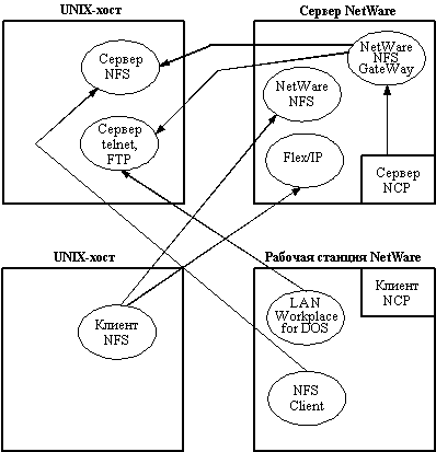 NetWare NFS v1.2 NetWare NFS обеспечивает прозрачную интеграцию UNIX-систем с файловой системой и ресурсами NetWare 3.11, предоставляя пользователям UNIX доступ к среде NetWare из их "родного" программного окружения с использованием привычной для них процедуры монтирования удаленной файловой системы сервера NetWare. UNIX-клиенты могут использовать NetWare NFS для доступа к файлам NetWare и другим сетевым ресурсам совместно с другими NetWare-клиентами, такими как DOS, OS/2 и Macintosh-компьютеры. NetWare NFS использует коммуникационный транспортный протокол TCP/IP, широко применяемый в UNIX-системах и стандартный для NFS. Благодаря этому не возникает необходимости в дополнительном программном обеспечении на стороне UNIX-клиентов. Возможности NetWare NFS: