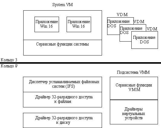 ![]() Рис. 8.4. Архитектура ОС Windows 3.1 В состав операционной системы Windows 3.1 (рис 8.4) входит системная виртуальная машина System VM, внутри которой размещаются все 16-разрядные приложения Win16, а также код и данные системных DLL, которые обеспечивают выполнение сервисных функций ОС. Приложения Win16 выполняются в общем адресном пространстве внутри системной виртуальной машины. Программы Win16 выполняются в режиме невытесняющей многозадачности. Системные библиотеки USER, GDI и KERNEL предоставляют сервисные функции операционной системы приложениям и отображаются в адресное пространство, совместно используемое приложениями Win16. Приложения DOS запускаются на отдельных виртуальных DOS-машинах (VDM), работающих в режиме вытесняющей многозадачности. Диспетчер устанавливаемых файловых систем (IFS) и драйвер 32-разрядного доступа к файлам (только в Windows for Workgroups 3.11) осуществляют большинство файловых операций в защищенном режиме, что ускоряет доступ к файлам. Драйвер 32-разрядного доступа к диску управляет обменом с диском на физическом уровне.