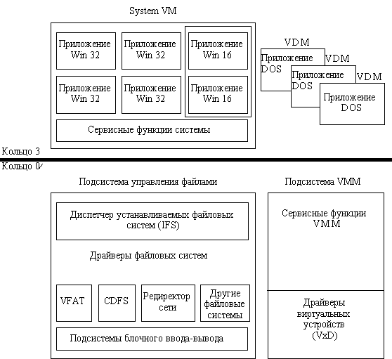 ![]() Рис. 8.5. Архитектура ОС Windows 95 Подсистема управления виртуальными машинами (VM Manager, VMM) предоставляет сервисные функции низкого уровня, такие как распределение процессорного времени между VM и управление виртуальной памятью. Сюда также относятся драйверы виртуальных устройств (VxD) для аппаратуры. Архитектура Windows 95 (рисунок 8.5) представляет собой немного улучшенную версию архитектуры Windows 3.1. Внутри системной VM выполняются приложения Win16 и Win32. Большая часть кода операционной системы и данных также размещается здесь. Приложения Win32 работают на основе алгоритма вытесняющей многозадачности в отдельных адресных пространствах. Все приложения Win16 выполняются как единый процесс в общем адресном пространстве на основе алгоритма невытесняющей многозадачности. Библиотеки динамической компоновки USER, USER32, GDI, GDI32, KERNEL и KERNEL32, которые предоставляют системные сервисы всем приложениям, загружаются в системную VM и отображаются в адресные пространства каждого прикладного процесса. Это повышает производительность за счет устранения затрат времени на переходы между кольцами защиты при вызове системных функций. Однако с другой стороны, это также ставит под угрозу целостность системы, открывая доступ к частям ОС для прикладных программ. На виртуальных DOS-машинах (VDM) выполняются DOS-программы. Они работают в режиме вытесняющей многозадачности.
