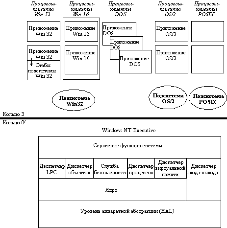 ![]() Рис. 8.6. Архитектура ОС Windows NT Подсистема управления файлами Windows 95 работает в нулевом кольце защиты и обрабатывает все вызовы, связанные с вводом-выводом. Большинство вызовов обрабатывается в защищенном режиме, но некоторые по-прежнему приводят к переключению в режим Virtual 86, и обрабатываются в реальном режиме DOS. Диспетчер устанавливаемых файловых систем IFS передает вызовы файлового ввода-вывода драйверу соответствующей файловой системы. Драйвер файловой системы VFAT реализует собственную VFAT-систему Windows 95, которая похожа на файловую систему FAT с добавленными средствами обработки длинных имен файлов. Драйвер CDFS заменяет MSCDEX и управляет операциями по вводу данных с накопителей CD ROM. Редиректор, выполненный в виде драйвера файловой системы, обеспечивает обращение к сетевым накопителям. Можно устанавливать дополнительные драйверы файловых систем. Подсистема блочного ввода-вывода выполняет соответствующие операции на физическом уровне в ответ на запросы драйверов файловых систем. Подсистема управления виртуальными машинами (VMM) предоставляет низкоуровневые сервисные функции, например, планирование нитей и управление памятью. Сюда также относятся драйверы виртуальных устройств (VxD) для аппаратуры. На рисунке 8.6 представлена уже знакомая структура Windows NT, в которой каждое из приложений обращается к сервисным функциям (серверам) косвенно, через вызовы локальных процедур (LPC), реализованных в диспетчере LPC, являющемся частью NT Executive и работающем в привилегированном режиме. Приложения Win32 исполняются как отдельные многонитевые процессы. Программы Win16 могут запускаться как однонитевые процессы на общей виртуальной машине, или на собственной виртуальной машине, что обеспечивает им большую степень защищенности от других программ Win16. Приложения DOS выполняются как отдельные процессы на отдельных виртуальных DOS-машинах (VDM). Среда машины в рамках VDM конструируется таким образом, чтобы как можно более точно имитировать среду реального режима DOS. Подсистемы OS/2 и POSIX обеспечивают работу соответствующих прикладных программ в текстовом режиме. Windows NT Executive предоставляет сервисные функции ОС, необходимые для подсистем пользовательского режима и реализует внутренние механизмы системы, такие, например, как планирование нитей и управление памятью. Слой системных сервисных функций служит интерфейсом между программами пользовательского режима и NT Executive.