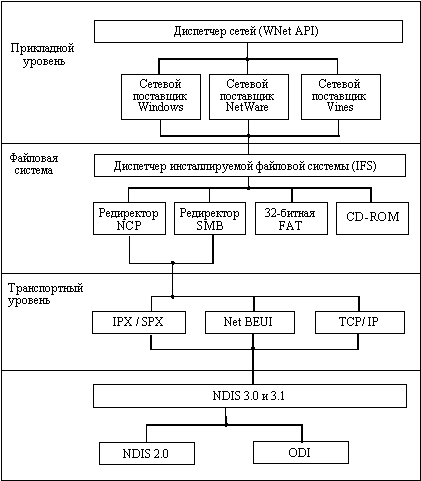 ![]() Рис. 8.7. Структура сетевых средств Windows 95 Ядро обрабатывает прерывания и исключительные ситуации, переключает нити, синхронизирует процессоры в многопроцессорных системах и выполняет другие низкоуровневые функции, используемые при работе NT Executive. На рисунке 8.7 представлена организация сетевых средств Windows 95, очень напоминающая аналогичную структуру сетевых средств Windows NT. Это и не удивительно - обе системы поддерживают один и тот же программный интерфейс WNet, с помощью которого приложения и системные утилиты получают доступ к просмотру, отображению и потреблению сетевых ресурсов. Как видно из следующей таблицы, разбиение версий Windows на два семейства - NT и 95 - явление временное. Оно вызвано скорее не стратегическими соображениями, а тактикой борьбы за пользователей в условиях, когда мощность большей части персональных компьютеров, установленных в настоящее время у пользователей, оказалась явно недостаточной для эффективной работы Windows NT. Ввиду угрозы перетекания конечных пользователей на более компактную и менее ресурсоемкую (по сравнению с Windows NT) OS/2 Warp Connect компания Microsoft и выпустила Windows 95, как некоторую временную ОС с ограниченным сроком годности - не более 5 лет, как это видно из таблицы. И хотя Microsoft планирует выпустить еще 2 версии, улучшающие свойства Windows 95, наличие некоторых общих свойств у Windows NT и Windows 95, а также очевидные слабости Windows 95, говорят о том, что долговременная стратегия Microsoft связана с линией Windows NT, многие из новых свойств которой будут отрабатываться и в версиях линии Windows 95 (как сейчас это произошло с пользовательским интерфейсом и некоторыми системными утилитами типа клиента Microsoft Exchange).
