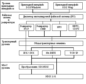 ![]() Рис. 9.1. Структура OS/2 На рисунке 9.2 изображены сетевые средства OS/2 Warp Connect. Они делятся на четыре уровня. Прикладной уровень включает программные интерфейсы приложений операционной системы. Компоненты на уровне файловой системы отвечают за выполнение файловых операций. Транспортный уровень реализует коммуникационные протоколы. Имеется компонента Общая транспортная семантика (Common Transport Semantic), которая позволяет использовать любую файловую систему (а точнее ее редиректор) в сочетании с любым протоколом транспортного уровня.