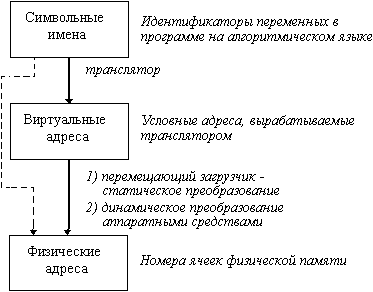 Управление памятьюПамять является важнейшим ресурсом, требующим тщательного управления со стороны мультипрограммной операционной системы. Распределению подлежит вся оперативная память, не занятая операционной системой. Обычно ОС располагается в самых младших адресах, однако может занимать и самые старшие адреса. Функциями ОС по управлению памятью являются: отслеживание свободной и занятой памяти, выделение памяти процессам и освобождение памяти при завершении процессов, вытеснение процессов из оперативной памяти на диск, когда размеры основной памяти не достаточны для размещения в ней всех процессов, и возвращение их в оперативную память, когда в ней освобождается место, а также настройка адресов программы на конкретную область физической памяти. Типы адресовДля идентификации переменных и команд используются символьные имена (метки), виртуальные адреса и физические адреса (рисунок 2.7). Символьные имена присваивает пользователь при написании программы на алгоритмическом языке или ассемблере. Виртуальные адреса вырабатывает транслятор, переводящий программу на машинный язык. Так как во время трансляции в общем случае не известно, в какое место оперативной памяти будет загружена программа, то транслятор присваивает переменным и командам виртуальные (условные) адреса, обычно считая по умолчанию, что программа будет размещена, начиная с нулевого адреса. Совокупность виртуальных адресов процесса называется виртуальным адресным пространством. Каждый процесс имеет собственное виртуальное адресное пространство. Максимальный размер виртуального адресного пространства ограничивается разрядностью адреса, присущей данной архитектуре компьютера, и, как правило, не совпадает с объемом физической памяти, имеющимся в компьютере.