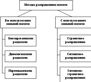![]() Рис. 2.7. Типы адресов Физические адреса соответствуют номерам ячеек оперативной памяти, где в действительности расположены или будут расположены переменные и команды. Переход от виртуальных адресов к физическим может осуществляться двумя способами. В первом случае замену виртуальных адресов на физические делает специальная системная программа - перемещающий загрузчик. Перемещающий загрузчик на основании имеющихся у него исходных данных о начальном адресе физической памяти, в которую предстоит загружать программу, и информации, предоставленной транслятором об адресно-зависимых константах программы, выполняет загрузку программы, совмещая ее с заменой виртуальных адресов физическими. Второй способ заключается в том, что программа загружается в память в неизмененном виде в виртуальных адресах, при этом операционная система фиксирует смещение действительного расположения программного кода относительно виртуального адресного пространства. Во время выполнения программы при каждом обращении к оперативной памяти выполняется преобразование виртуального адреса в физический. Второй способ является более гибким, он допускает перемещение программы во время ее выполнения, в то время как перемещающий загрузчик жестко привязывает программу к первоначально выделенному ей участку памяти. Вместе с тем использование перемещающего загрузчика уменьшает накладные расходы, так как преобразование каждого виртуального адреса происходит только один раз во время загрузки, а во втором случае - каждый раз при обращении по данному адресу. В некоторых случаях (обычно в специализированных системах), когда заранее точно известно, в какой области оперативной памяти будет выполняться программа, транслятор выдает исполняемый код сразу в физических адресах. Методы распределения памяти без использования дискового пространстваВсе методы управления памятью могут быть разделены на два класса: методы, которые используют перемещение процессов между оперативной памятью и диском, и методы, которые не делают этого (рисунок 2.8). Начнем с последнего, более простого класса методов.