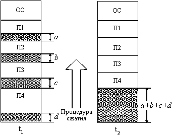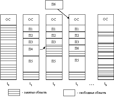 При очевидном преимуществе - простоте реализации - данный метод имеет существенный недостаток - жесткость. Так как в каждом разделе может выполняться только одна программа, то уровень мультипрограммирования заранее ограничен числом разделов не зависимо от того, какой размер имеют программы. Даже если программа имеет небольшой объем, она будет занимать весь раздел, что приводит к неэффективному использованию памяти. С другой стороны, даже если объем оперативной памяти машины позволяет выполнить некоторую программу, разбиение памяти на разделы не позволяет сделать этого. Распределение памяти разделами переменной величиныВ этом случае память машины не делится заранее на разделы. Сначала вся память свободна. Каждой вновь поступающей задаче выделяется необходимая ей память. Если достаточный объем памяти отсутствует, то задача не принимается на выполнение и стоит в очереди. После завершения задачи память освобождается, и на это место может быть загружена другая задача. Таким образом, в произвольный момент времени оперативная память представляет собой случайную последовательность занятых и свободных участков (разделов) произвольного размера. На рисунке 2.10 показано состояние памяти в различные моменты времени при использовании динамического распределения. Так в момент t0 в памяти находится только ОС, а к моменту t1 память разделена между 5 задачами, причем задача П4, завершаясь, покидает память. На освободившееся после задачи П4 место загружается задача П6, поступившая в момент t3.