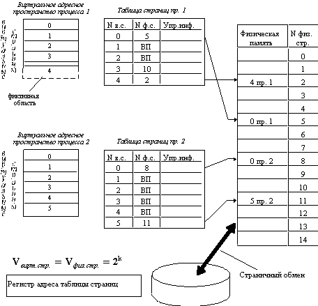 Все эти действия выполняются автоматически, без участия программиста, то есть механизм виртуальной памяти является прозрачным по отношению к пользователю. Наиболее распространенными реализациями виртуальной памяти является страничное, сегментное и странично-сегментное распределение памяти, а также свопинг. Страничное распределениеНа рисунке 2.12 показана схема страничного распределения памяти. Виртуальное адресное пространство каждого процесса делится на части одинакового, фиксированного для данной системы размера, называемые виртуальными страницами. В общем случае размер виртуального адресного пространства не является кратным размеру страницы, поэтому последняя страница каждого процесса дополняется фиктивной областью. Вся оперативная память машины также делится на части такого же размера, называемые физическими страницами (или блоками). Размер страницы обычно выбирается равным степени двойки: 512, 1024 и т.д., это позволяет упростить механизм преобразования адресов. При загрузке процесса часть его виртуальных страниц помещается в оперативную память, а остальные - на диск. Смежные виртуальные страницы не обязательно располагаются в смежных физических страницах. При загрузке операционная система создает для каждого процесса информационную структуру - таблицу страниц, в которой устанавливается соответствие между номерами виртуальных и физических страниц для страниц, загруженных в оперативную память, или делается отметка о том, что виртуальная страница выгружена на диск. Кроме того, в таблице страниц содержится управляющая информация, такая как признак модификации страницы, признак невыгружаемости (выгрузка некоторых страниц может быть запрещена), признак обращения к странице (используется для подсчета числа обращений за определенный период времени) и другие данные, формируемые и используемые механизмом виртуальной памяти.