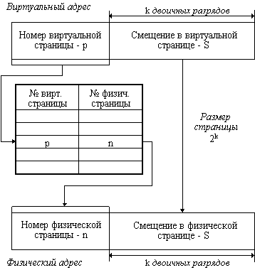 В некоторых системах используется понятие рабочего множества страниц. Рабочее множество определяется для каждого процесса и представляет собой перечень наиболее часто используемых страниц, которые должны постоянно находиться в оперативной памяти и поэтому не подлежат выгрузке. После того, как выбрана страница, которая должна покинуть оперативную память, анализируется ее признак модификации (из таблицы страниц). Если выталкиваемая страница с момента загрузки была модифицирована, то ее новая версия должна быть переписана на диск. Если нет, то она может быть просто уничтожена, то есть соответствующая физическая страница объявляется свободной. Рассмотрим механизм преобразования виртуального адреса в физический при страничной организации памяти (рисунок 2.13). Виртуальный адрес при страничном распределении может быть представлен в виде пары (p, s), где p - номер виртуальной страницы процесса (нумерация страниц начинается с 0), а s - смещение в пределах виртуальной страницы. Учитывая, что размер страницы равен 2 в степени к, смещение s может быть получено простым отделением k младших разрядов в двоичной записи виртуального адреса. Оставшиеся старшие разряды представляют собой двоичную запись номера страницы p.