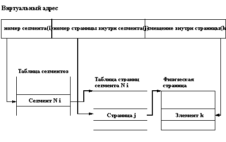 ![]() Рис. 3.1. Схема страничной организации виртуальной памяти При сегментно-страничной организации виртуальной памяти происходит двухуровневая трансляция виртуального адреса в физический. В этом случае виртуальный адрес состоит из трех полей: номера сегмента виртуальной памяти, номера страницы внутри сегмента и смещения внутри страницы. Соответственно, используются две таблицы отображения - таблица сегментов, связывающая номер сегмента с таблицей страниц, и отдельная таблица страниц для каждого сегмента (рисунок 3.2).