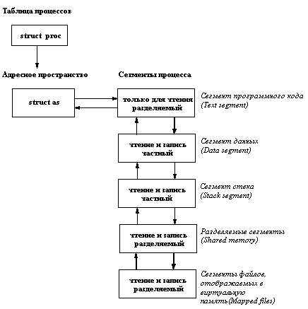 ![]() Рис. 3.3. Сегментная структура виртуального адресного пространства Как видно из рисунка, виртуальная память процесса ОС UNIX разбивается на сегменты пяти разных типов. Три типа сегментов обязательны для каждой виртуальной памяти, и сегменты этих типов присутствуют в виртуальной памяти в одном экземпляре для каждого типа. Сегмент программного кода содержит только команды. Реально в него помещается соответствующий сегмент выполняемого файла, который указывался в качестве параметра системного вызова exec для данного процесса. Сегмент программного кода не может модифицироваться в ходе выполнения процесса и потому возможно использование одного экземпляра кода для разных процессов. Сегмент данных содержит инициализированные и неинициализированные статические переменные программы, выполняемой в данном процессе (на этом уровне изложения под статическими переменными лучше понимать области виртуальной памяти, адреса которых фиксируются в программе при ее загрузке и действуют на протяжении всего ее выполнения). Понятно, что поскольку речь идет о переменных, содержимое сегмента данных может изменяться в ходе выполнения процесса, следовательно, к сегменту должен обеспечиваться доступ и по чтению, и по записи. С другой стороны, поскольку мы говорим о собственных переменных данной программы, нельзя разрешить нескольким процессам совместно использовать один и тот же сегмент данных (по причине несогласованного изменения одних и тех же переменных разными процессами ни один из них не мог бы успешно завершиться). Сегмент стека - это область виртуальной памяти, в которой размещаются автоматические переменные программы, явно или неявно в ней присутствующие. Этот сегмент, очевидно, должен быть динамическим (т.е. доступным и по чтению, и по записи), и он, также очевидно, должен быть частным (приватным) сегментом процесса. Разделяемый сегмент виртуальной памяти образуется при подключении к ней сегмента разделяемой памяти (см. п. 3.4.1). По определению, такие сегменты предназначены для координированного совместного использования несколькими процессами. Поэтому разделяемый сегмент должен допускать доступ по чтению и по записи и может разделяться несколькими процессами. Сегменты файлов, отображаемых в виртуальную память (см. п. 2.4.5), представляют собой разновидность разделяемых сегментов. Разница состоит в том, что если при необходимости освободить оперативную память страницы разделяемых сегментов копируются ("откачиваются") в специальную системную область подкачки (swapping space) на диске, то страницы сегментов файлов, отображаемых в виртуальную память, в случае необходимости откачиваются прямо на свое место в области внешней памяти, занимаемой файлом. Такие сегменты также допускают доступ и по чтению, и по записи и являются потенциально совместно используемыми. На аппаратно-независимом уровне сегментная организация виртуальной памяти каждого процесса описывается структурой as, которая содержит указатель на список описателей сегментов, общий текущий размер виртуальной памяти (т.е. суммарный размер всех существующих сегментов), текущий размер физической памяти, которую процесс занимает в данный момент времени, и наконец, указатель на некоторую аппаратно-зависимую структуру, данные которой используются при отображении виртуальных а