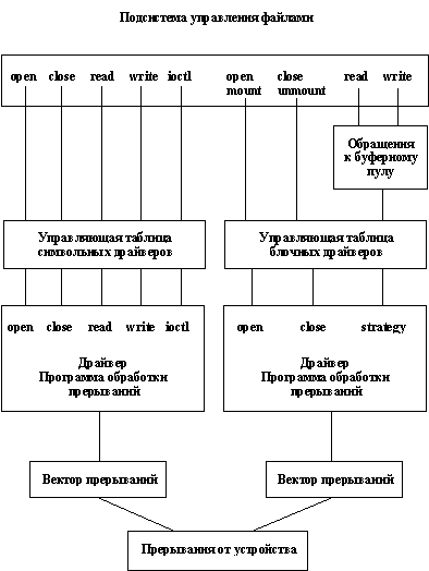 Операция записи выполняется аналогичным образом, но меняет содержимое буфера буферного пула. Системный вызов close приводит к тому, что драйвер обрывает связь с соответствующим пользовательским процессом и (в случае последнего по времени закрытия устройства) устанавливает общесистемный флаг "драйвер свободен". Наконец, для специальных файлов поддерживается еще один "специальный" системный вызов ioctl. Это единственный системный вызов, который обеспечивается для специальных файлов и не обеспечивается для остальных разновидностей файлов. Фактически, системный вызов ioctl позволяет произвольным образом расширить интерфейс любого драйвера. Параметры ioctl включают код операции и указатель на некоторую область памяти пользовательского процесса. Всю интерпретацию кода операции и соответствующих специфических параметров проводит драйвер. Естественно, что поскольку драйверы главным образом предназначены для управления внешними устройствами, программный код драйвера должен содержать соответствующие средства для обработки прерываний от устройства. Вызов индивидуальной программы обработки прерываний в драйвере происходит из ядра операционной системы. Подобным же образом в драйвере может быть объявлен вход "timeout", к которому обращается ядро при истечении ранее заказанного драйвером времени (такой временной контроль является необходимым при управлении не слишком интеллектуальными устройствами). Общая схема интерфейсной организации драйверов показана на рисунке 3.5. Как показывает этот рисунок, с точки зрения интерфейсов и общесистемного управления различаются два вида драйверов - символьные и блочные. С точки зрения внутренней организации выделяется еще один вид драйверов - потоковые (stream) драйверы (мы уже упоминали о потоках в п. 2.7.1). Однако по своему внешнему интерфейсу потоковые драйверы не отличаются от символьных.