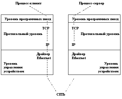 ![]() Рис. 3.7. Одна из возможных конфигураций программных гнезд Допустимые комбинации протоколов и драйверов задаются при конфигурации системы, и во время работы системы их менять нельзя. Легко видеть, что по своему духу организация программных гнезд близка к идее потоков (см. пп. 2.7.1 и 3.4.6), поскольку основана на разделении функций физического управления устройством, протокольных функций и функций интерфейса с пользователями. Однако это менее гибкая схема, поскольку не допускает изменения конфигурации "на ходу". Взаимодействие процессов на основе программных гнезд основано на модели "клиент-сервер". Процесс-сервер "слушает (listens)" свое программное гнездо, одну из конечных точек двунаправленного пути коммуникаций, а процесс-клиент пытается общаться с процессом-сервером через другое программное гнездо, являющееся второй конечной точкой коммуникационного пути и, возможно, располагающееся на другом компьютере. Ядро поддерживает внутренние соединения и маршрутизацию данных от клиента к серверу. Программные гнезда с общими коммуникационными свойствами, такими как способ именования и протокольный формат адреса, группируются в домены. Наиболее часто используемыми являются "домен системы UNIX" для процессов, которые взаимодействуют через программные гнезда в пределах одного компьютера, и "домен Internet" для процессов, которые взаимодействуют в сети в соответствии с семейством протоколов TCP/IP (см. п. 2.7.2). Выделяются два типа программных гнезд - гнезда с виртуальным соединением (в начальной терминологии stream sockets) и датаграммные гнезда (datagram sockets). При использовании программных гнезд с виртуальным соединением обеспечивается передача данных от клиента к серверу в виде непрерывного потока байтов с гарантией доставки. При этом до начала передачи данных должно быть установлено соединение, которое поддерживается до конца коммуникационной сессии. Датаграммные программные гнезда не гарантируют абсолютной надежной, последовательной доставки сообщений и отсутствия дубликатов пакетов данных - датаграмм. Но для использования датаграммного режима не требуется предварительное дорогостоящее установление соединений, и поэтому этот режим во многих случаях является предпочтительным. Система по умолчанию сама обеспечивает подходящий протокол для каждой допустимой комбинации "домен-гнездо". Например, протокол TCP используется по умолчанию для виртуальных соединений, а протокол UDP - для датаграммного способа коммуникаций (информация об этих протоколах представлена в п. 2.7.2). Для работы с программными гнездами поддерживается набор специальных библиотечных функций (в UNIX BSD это системные вызовы, однако, как мы отмечали в п. 2.7.3, в UNIX System V они реализованы на основе потокового интерфейса TLI). Рассмотрим кратко интерфейсы и семантику этих функций. Для создания нового программного гнезда используется функция socket: sd = socket(domain, type, protocol); где значение параметра domain определяет домен данного гнезда, параметр type указывает тип создаваемого программного гнезда (с виртуальным соединением или датаграммное), а значение параметра protocol определяет желаемый сетевой протокол. Заметим, что если значением параметра protocol является нуль, то система сама выбирает подходящий протокол для комбинации значений параметров domain и type, это наиболее распространенный способ использ