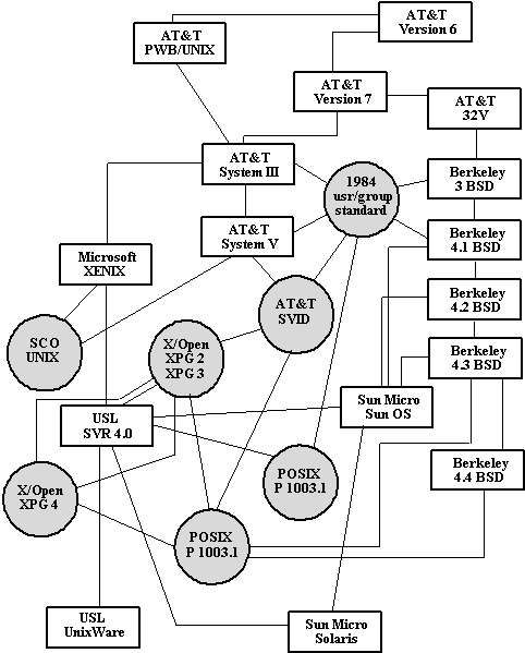 AT&T System V Release 2 и Release 3В начале 1983 года компания American Telephone and Telegraph Bell Laboratories (AT&T Bell Labs) объявила о выпуске UNIX System V. Впервые в истории Bell Labs было также объявлено, что AT&T будет поддерживать этот и все будущие выпуски System V. Кроме того, была обещана совместимость выпущенной версии System V со всеми будущими версиями. ОС UNIX System V включала много новых возможностей, но почти все они относились к повышению производительности (хеш-таблицы и кэширование данных). На самом деле UNIX System V являлась развитым вариантом UNIX System III. К наиболее важным оригинальным особенностям UNIX System V относится появление семафоров, очередей сообщений и разделяемой памяти. В 1984 году USG была преобразована в Лабораторию по развитию системы UNIX (UNIX System Development Laboratories - USDL). В 1984 году USDL выпустила UNIX System V Release 2 (SVR2). В этом варианте системы появились возможности блокировок файлов и записей, копирования совместно используемых страниц оперативной памяти при попытке записи (copy-on-write), страничного замещения оперативной памяти (реализованного не так, как в BSD) и т.д. К этому времени ОС UNIX была установлена на более чем 100000 компьютеров. В 1987 году подразделение USDL объявило о выпуске UNIX System V Release 3 (SVR3). В этой системе появились полные возможности межпроцессных взаимодействий, разделения удаленных файлов (Remote File Sharing - RFS), развитые операции обработки сигналов, разделяемые библиотеки и т.д. Кроме того, были обеспечены новые возможности по повышению производительности и безопасности системы. К концу 1987 года появилось более 750000 установок ОС UNIX, и было зарегистрировано 4,5 млн. пользователей. На этом мы заканчиваем исторический обзор ОС UNIX, поскольку вплотную подошли к современному состоянию системы. Продолжим этот разговор в конце курса, а пока ограничимся таблицей 1.1 и рисунком генеалогического дерева ОС UNIX (заметим, что по поводу генеалогии существуют разные мнения).