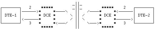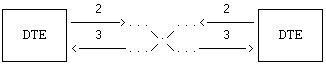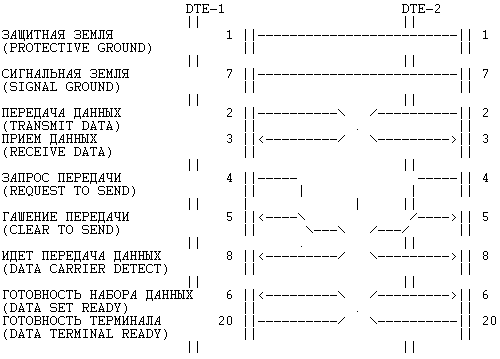 ![]() На каждом конце находятся терминальные устройства, называемые DTE (data terminating equipment). В роли DTE может выступать терминал, например, VT-100, или центральный процессор микро-, миниили большой ЭВМ. Каждое терминальное устройство DTE должно использовать коммуникационное устройство DCE, называемое обычно модемом, для модуляции и демодуляции сигналов, проходящих по телефонным линиям. Каждое DTE использует вывод номер 2 для передачи данных и вывод номер 3 для получения данных. Поскольку то, что передано с вывода 2 на каждой машине, принимается на выводе 3 другой машины, возникает перекрещивание телефонных линий между устройствами DCE. Подсоединение и обработка сигнала между DTE и DCE полностью соответствуют стандарту RS-232-C. Аппаратный протокол позволяет DTE использовать DCE для посылки и приема данных от другого DTE. Кабель, связывающий физически DTE и DCE, называется "прямолинейным" кабелем. Он позволяет устройству DTE посылать команды (или сигналы с выводов) на DCE, а устройству DCE отправлять команды обратно на DTE. Подключение DCE одной машины к DCE другой машины производится через обычные телефонные линии. Устройства DCE необходимы по той причине, что устройства DTE являются цифровыми, а телефонные линии - аналоговыми. Единственный способ передать цифровую информацию по аналоговым линиям закодировать цифровую информацию в аналоговый сигнал, послать этот сигнал по телефонным линиям, а затем декодировать аналоговый сигнал обратно в цифровую информацию. ПОДКЛЮЧЕНИЕ БЕЗ КОММУНИКАЦИОННЫХ УСТРОЙСТВЕсли ваши машины расположены довольно близко (в пределах 50 футов / 15 метров. Один фут составляет около 30.5 см. - Примеч. перев./), вам не нужен модем, вы можете использовать кабель "нулевого модема" вместо DCE. Кабель нулевого модема имитирует такой же протокол, что и DCE, но не требует наличия модема для коммуникаций. Основная задача подключения нулевого модема - обеспечить перекрещивание между передающими и принимающими сигналами. На рис. 82 показана общая схема подключения без устройств DCE. Рисунок 8-2.
