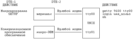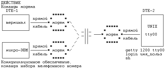 ![]() Терминал (когда он установлен на 1200 бод) общается непосредственно с модемом. При этом задействованы модемные команды "набрать телефонный номер" (dial), "повесить трубку" (hang up) и т.д. Микро-ЭВМ, запускающая коммуникационное программное обеспечение, обычно имеет команду набора номера, которая генерирует команду для модема. Соединение между терминалом/микро-ЭВМ и модемом должно быть выполнено в виде прямолинейного кабеля. Модем имеет также телефонный кабель, идущий в телефонную систему. Поскольку мы имеем дело с UNIX, последовательность действий при регистрации в системе такая же, как и рассмотренная ранее, за исключением того, что getty инициируется обычно со скоростью 1200 бод, чтобы соответствовать скорости модема. Если getty имеет другую скорость, переключите ее с помощью клавиши break на значение 1200 бод. Как только все действия по конфигурированию завершены, терминал или микро-ЭВМ может связаться с системой UNIX. Как это сделать? При регистрации пользователя в системе структура данных termcap используется для поддержки управления экраном. Если у вас еще нет записи в файле termcap, обратитесь к предыдущей главе, где описано, как подготовить такую запись. Терминалы (поскольку обычно они являются просто аппаратурой) не слишком гибки и дружественны по отношению к пользователю. Они не обладают широким спектром возможностей помимо регистрации в системе и запуска некоторых программ. Микро-ЭВМ, с другой стороны, имеют большую гибкость и могут многое добавить к пользовательскому интерфейсу с системой UNIX. Коммуникационные программы имеют обычно буфер памяти с прямой адресацией (RAM), который вы можете использовать для того, чтобы захватить данные и поместить их на диск. Благодаря применению этого буфера, вы можете избавиться от необходимости использовать специальные команды UNIX для передачи файлов. Вы можете дать команду включения захвата данных, затем отобразить файл на экран (используя, например, команду cat или просматривая файл редактором), если только этот файл не слишком большой для буфера. Следует иметь в виду, однако, что программные файлы или другие файлы, требующие стопроцентной точности при передаче, нужно передавать с явным использованием протокола проверки ошибок, поскольку телефонные линии или даже прямое подключение могут вносить "шумы" и один неверный символ может сделать программу бесполезной. Некоторые протоколы, поддерживаемые в мире микро-ЭВМ, приспособлены к машинам с системой UNIX, например программы xmodem и kermit. Из этих двух протоколов xmodem более широко распространен в мире микро-ЭВМ и поддерживается почти всеми системами типа досок объявлений. Kermit очень популярен в мире UNIX, имеет растущую популярность в мире микро-ЭВМ и доступен почти для каждой модели микро-ЭВМ за цену, немногим большую стоимости диска. Используя эти протоколы, микро-ЭВМ может посылать и принимать файлы из системы UNIX, и вам не нужно заботиться о контроле ошибок при передаче данных. Чтобы подробнее узнать об этих протоколах, проконсультируйтесь у администраторов вашей системы UNIX и у пользователей микро-ЭВМ, имеющих те же проблемы. ДОСТУП ИЗ СИСТЕМЫ UNIX К МИКРО-ЭВМОбратная ситуация, в отличие от только что рассмотренной, состоит в обращении из системы UNIX к системе, отличной от UNIX, функционирующей на микро-ЭВМ или на большой машине. Для того чтобы это сделать, необхо