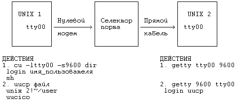 Эту связь можно проверить с помощью команды "ls -li /dev/tty* /dev/cul* /dev/cua*". Система "selector" в нашем файле L.sys также имеет набор номера, только подключается через коммутатор порта. Для общения с коммутатором порта необходима дополнительная информация, которая начинается с символов "\d". Поля в файле L.sys следуют в таком порядке: "ожидание посылка ожидание посылка ...". Когда мы в первый раз подключаемся к селектору порта, в нашу линию ничего не выводится. Просто он так работает. Селектору нужен символ , чтобы стать активным, а первое поле uucp означает ожидание. Как нам ничего не дождаться и послать возврат каретки? Путем указания uucp ожидать невозможный символ, например control-D (\d). Uucp никогда не получит его, поэтому по тайм-ауту эта программа выдаст возврат каретки (-). Если слово CLASS приходит назад, когда мы посылаем CR, то мы отправляем символ "A", который означает класс системной идентификации, указанный в данной записи. Когда связь устанавливается, мы ищем "ogin:" в качестве регистрационной подсказки. Если мы не находим ее, то посылаем символы возврата каретки. Это может потребоваться по той причине, что инициирующий процесс getty в системе A может быть настроен на 9600 бод. Тогда мы должны будем послать либо символы возврата каретки, либо символы break, чтобы сбросить скорость обмена до 1200 бод. Последняя системная запись "direct" не использует ACU и телефонный номер. Она собирается обращаться к терминальной линии tty00 на скорости 9600 бод, чтобы получить регистрационную последовательность. Здесь нет селектора порта, через который нужно пройти, а есть просто прямая линия. В файле L-devices эта линия описана так: