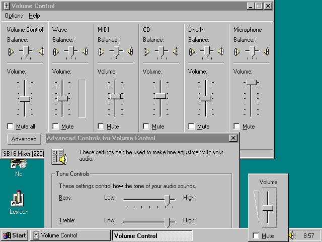 CD-ROM-драйвы с нестандартным интерфейсом все еще являются самыми распространенными. Для их подключения к ПК нужно применять либо специальную плату-контроллер (с соответствующими переключателями), либо использовать плату аудиоадаптера, имеющую специальный разъем для подключения данного драйва. В последнее время разработчики и производители CD-ROM драйвов отдают предпочтением их моделям со стандартным интерфейсом (IDE или SCSI). Будьте осторожны при случайном приобретении CD-ROM-драйва, так как несоответствие интерфейсов может сделать покупку вместо радости пустой тратой денег. Стандарт MPC-1 предусматривал скорость считывания CD-ROM-драйвов 150 Кбайт/с. Эта скорость называется одинарной. Стандарт MPC-2 предусматривает двойную скорость, т.е. не менее 300 Кбайт/с. Сейчас уже есть серийные драйвы с кратностью скорости считывания от 3 до 8. По-видимому, наиболее целесообразными (в том числе с экономических позиций) являются драйвы с четырехкратной скоростью. Употребляемый иногда термин "четырехскоростной драйв" не удачен, поскольку драйв имеет не четыре скорости, а просто ускоренную в 4 раза скорость считывания. Еще один важный параметр - среднее время доступа. Он определяет время, которое нужно для поиска заданной информации (обычно файла). Типовые значения этого времени от 0.2 до 0.5 с. Таким образом, это время лучше, чем у накопителей для гибких дисков, но заметно хуже, чем у современных накопителей на жестких дисках (винчестерах). Чем меньше среднее время доступа, тем лучше. На скорость работы драйва в реальных условиях большое влияние оказывает установленная в драйве буферная память. Ее емкость обычно в пределах от 32 Кбайт и у простых и дешевых драйвов до 256/512 Кбайт у дорогих моделей. В эту память, именуемую кешем драйва, автоматически заносятся наиболее часто используемые данные и по мере необходимости быстро извлекаются из нее. Чем больше емкость кеша (при прочих равных условиях), тем быстрее осуществляется доступ к информации. 47. Как управлять звуком? Итак, если ваш ПК оснащен аудиоадаптером, он (как минимум) становится способным воспроизводить звуковые файлы с записями голосов и прочих звуков, а также звуков, создаваемых музыкальными синтезаторами. Разумеется, при этом возникает необходимость регулировки уровней звуковых сигналов, как по общему выходу (Master), так и по отдельным источникам звуковых сигналов - от микрофона, линии, проигрывателя звуковых файлов и синтезатора музыкальных звуков. Некоторые платы звука оснащены и программно-управляемыми регуляторами тембра. Если в ПК установлен аудиоадаптер, то в конце линейки переключателя задач TaskBar (внизу рабочего стола) появится кнопка с изображением динамика, активизация которой вызывает появление на экране микшера или общего регулятора громкости (что именно зависит от того, в какое место динамика вы тыкаете курсором мышки). На "Рис.42.Средства управления аудиоадаптером системы Windows 95", они показаны совместно - вывод микшера или общего регулятора зависит от того, в какой части пиктограммы находится графический курсор мышки перед нажатием ее левой клавиши. Как видно из "Рис.42. Средства управления аудиоадаптером системы Windows 95", микшер имеет отдельные ползунковые регуляторы уровня сигнала и баланса по всем входам: общему (Volume Control),звуковому (Wave), синтезатора (MIDI), проигрывателя компакт-дисков (CD),