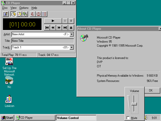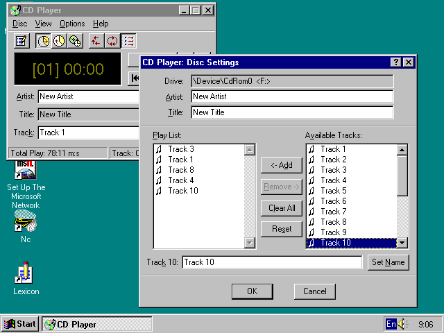 | Help | - вывод помощи (Help Topics) и информации о данном приложении (About CD Player). | Вид проигрывателя зависит от установок в позиции Options главного меню. К примеру, можно убрать (что сделано по умолчанию) или вывести строку с пиктограммами быстрого управления - инструментальный ящик (ToolBar). На "Рис.43. Проигрыватель звуковых компакт-дисков Windows 95" показан вид проигрывателя с выведенным инструментальным ящиком и окном позиции About CD Player (О CD-Плейере). Из возможностей проигрывателя прежде всего надо отметить программирование порядка исполнения записей, имеющихся на компакт-диске (треков). Для этого используется команда Edit Play List ... (редактирование списка исполняемых произведений). При этом появляется окно со списком исполняемых произведений и списком произведений, имеющихся на диске - "Рис.44. Программирование порядка исполнения треков"В список исполняемых произведений можно внести в любом порядке произведения из общего списка записей на диске. Другие возможности редактирования (например, частичная или полная очистка листа произведений) довольно очевидны. После закрытия данного окна проигрыватель начинает проигрывать записи в установленном содержанием Play List порядке. Проигрыватель CD Windows 95 может работать в фоновом режиме. Для этого достаточно свернуть (но не закрыть совсем) окно проигрывателя, сделав активной первую кнопку в правом верхнем углу окна. Так что теперь вы можете наслаждаться роком или классикой, совмещая полезное (работу с другими приложениями) с приятным (прослушиванием музыки).