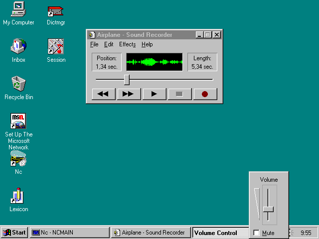 Как недостаток Windows 95 можно отметить резкое падение скорости вывода видеоинформации для стандартного режима VGA с 16 цветами - наблюдалось резкое падение скорости обмена кадров, так что просматривать в этом режиме видеофильмы практически нельзя. Возможно более оптимальная настройка системы позволяет устранить этот недостаток, но нужно ли делать это? Дело в том, что качество цветных изображений при 16 цветах настолько низко, что этот видеорежим для просмотра видеофильмов попросту нежелателен.К сожалению, пользователи большинства ПК, даже относящихся к классу MPC, не могут самостоятельно записывать файлы видеофильмов с расширением .AVI. Для этого необходимо оснащение ПК еще одной дорогостоящей (минимальная стоимость около 300$) платой - видеоадаптером класса VideoBlaster для ввода в ПК и обработки стандартных видеосигналов от телевизора, видеомагнитофона или видеокамеры. Для работы такой платы нужно и специальное программное обеспечение - впрочем, оно под Windows, как правило, поставляется вместе с видеоадаптером. Выпускаются и видеоадаптеры типа телевизионных тюнеров. Они принимают сигналы телевизионных станций и позволяют выводить их на экран дисплея (а иногда и записывать в виде файлов). 53. Как создать свой звуковой файл? Хотя Media Player Windows 95 позволяет проигрывать не только MIDI-файлы синтезированной музыки, но и обычные звуковые файлы с расширением WAV, для подготовки полноценных презентаций необходимы средства для записи звуков (с микрофона или линии) и подготовки WAV-файлов. Эти средства в Windows 95 предоставляет проигрыватель - рекордер Sound Recorder. Пиктограмма его запуска также находится в подменю программной группы Multimedia.На "Рис.47. Проигрыватель - рекордер Sound Recorder под Windows 95" представлен вид проигрывателя - рекордера Sound Recorder. Нетрудно заметить, что он очень похож на подобное виртуальное устройство из системы Windows 95 и исполнен в тех же строгих тонах, что и другие мультимедиа-приложения Windows 95.В верхней части окна видно главное меню, имеющее следующие позиции: