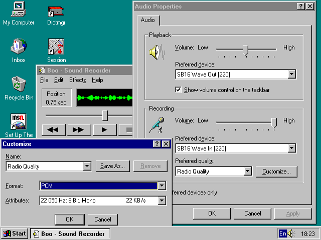 49. Возможен ли самозапуск CD-ROM? В некоторых случаях полезен самозапуск отдельных приложений. В подменю Programs стартового меню Windows 95 есть особая программная группа StartUp, которая по умолчанию пуста (ее содержимое индицируется как Empty (пусто). Однако, если в этой группе расположить пусковые файлы каких-либо приложений, то при загрузке Windows 95 все они окажутся запущенными. Например, таким образом вы можете загружать те приложения, к которым привыкли, скажем текстовый и графический редакторы.А можно ли пустить подобным образом CD-ROM? Для ответа на этот вопрос задумаемся над еще одним вопросом - чего ради мы вставляем CD-ROM в накопитель? Разумеется, для того, чтобы начать считывать с него информацию! Разработчики Windows 95 наконец поняли эту прописную истину и ввели новое удобное средство для работы с CD-ROM - их автозапуск.Рассчитанные на это CD-ROM должны иметь специальный файл AUTORUN.INF. Windows 95 прокручивает диск на предмет обнаружения этого файла и, если он обнаружен, запускает диск на считывание. Так что стоит просто вставить такой CD-ROM в дисковод, как он тут же будет запущен и вы сможете вовсю насладиться очередной игрой, энциклопедией или обучающей программой. 50. Что такое WAVE-, MIDI- и AVI-файлы? Прежде чем дальше описывать средства мультимедиа Windows 95 остановимся на типах файлов, с которыми работают мультимедиа приложения Windows 95. В отличие от приложений MS-DOS, для которых известны десятки форматов звуковых и видео-файлов, число практически значимых форматов файлов для Windows сведено до минимума.Есть два наиболее важных типов звуковых файлов - с расширениями .WAV и .MID. Файлы WAVE-типа несут в оцифрованном виде информацию о любых звуках, которые использовались для записи. Это могут быть звуки человеческого голоса, записанные с микрофона, звучание звуковых компакт-дисков или музыкального синтезатора. Хотя информация при записи WAVE-файлов сжимается как аппаратными, так и программными средствами, она содержит все необходимые данные о реальных звуках. А потому файлы с расширением .WAV, к сожалению, довольно громоздки - занимают сотни Кбайт на каждую минуту записи.Размер файлов зависит прежде всего от частоты квантования, задающей число выборок (отсчетов) звукового сигнала в единицу времени. Именно эти выборки представляются АЦП в виде двоичных чисел, несущих информацию о мгновенном значении сигнала в моменты выборок. Звуковые компакт-диски, к примеру, имеют частоту квантования 44.1 кГц. Считается (приближенно), что частота квантования должна быть вдвое выше высшей частоты спектра звуковых сигналов. Практически частота квантования в 44.1 кГц позволяет записывать (и затем воспроизводить) весь частотный диапазон звуковых сигналов - от 20 до 20 000 Гц. Однако для записей умеренного качества достаточен более узкий диапазон частот - например для разборчивой речи от примерно 400 до 3 500 Гц. Поэтому при записи WAVE-файлов предусматривается ряд частот квантования, чаще всего от 5 кГц до 44-45 кГц. Чем ниже частоты квантования, тем меньше (пропорционально) размер WAVE-файлов. Переход от двух-канальной (стереофонической) записи с одноканальной (монофонической) уменьшает длину звуковых файлов вдвое. Проигрыватели WAVE-файлов обычно автоматически распознают тип записи и частоту квантования.Следующий тип звуковых файлов, используемых в системах Windows,это MIDI-файлы. Реальной звуковой информации такие ф
