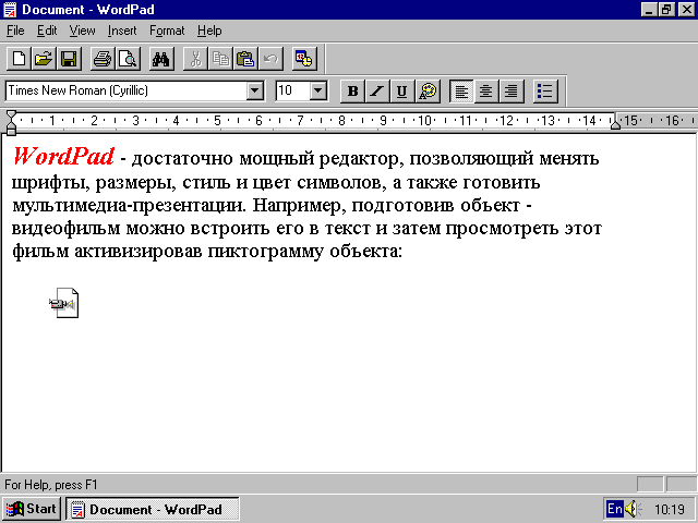 Озвучивание оболочки основано на прямой связи возможных ситуаций и команд оболочки Windows 95 с теми или иными звуковыми эффектами, получаемыми воспроизведением заданных звуковых файлов. В верхней части диалогового окна Sounds Properties находится переключатель ситуаций -Events. В нем выбирается нужная ситуация - например, в нашем случае выбрана ситуация Start Windows (старт оболочки Windows).Другой переключатель Sound служит для выбора файлов для звукового сопровождения выбранной ситуации. С помощью опций Browse... и Details можно более подробно ознакомиться с выбранными файлами, а с помощью опции Schemes даже составить схему сложного звукового сопровождения.В окне видны также две кнопки для контрольного прослушивания выбранного звукового файла. Одна кнопка с жирным треугольником запускает файл на прослушивание, другая с жирным квадратом служит для остановки прослушивания. Естественно, остановка автоматически происходит и в том случае, когда выбранный файл проигрывается до конца.Итак, перебрав возможные ситуации и команды Windows 95 и связав их с нужными звуковыми файлами, можно озвучить систему "на все случаи жизни". Однако следует помнить, что при начальной установке Windows 95 в ее составе поставляется единственный звуковой WAVE-файл с именем "The Microsoft Sound". Так что, если вы желаете озвучить помимо старта и другие ситуации, вам надо подыскать подходящие звуковые файлы. Этого добра полным полно на CD-ROM с библиотеками звуковых файлов.56. Как подготовить мультимедиа-презентацию? Редактор WordPad можно успешно использовать для подготовки простых и довольно эффектных презентаций, поскольку он поддерживает технологию OLE, как и другие приложения Windows 95. К примеру, вы можете с помощью проигрывателя Media Player или приложения Sound Record создать объект в виде исполняемого музыкального произведения, голосового комментария или даже видеофильма. Затем, используя команду Copy Object позиции Edit главного меню соответствующего приложения, можно создать демонстрируемый в WordPAD объект.Используя команду Insert Object в редакторе WordPad и указав тип объекта (например, видеофильм), перенести объект в окно редактирования текста WordPad - он примет вид пиктограммы на месте расположения курсора (она видна на "Рис.51. Текст WordPad с пиктограммой проигрывания музыки"под текстом и имеет вид кинопроектора). В дальнейшем активизация этой пиктограммы приведет к проигрыванию заданного видеофайла.Таким образом можно создавать довольно большие презентации, у которых фрагменты текста перемежаются с музыкальными паузами, речевыми комментариями, демонстрацией слайдов (в том числе с помощью описанного далее графического редактора Paint) и даже просмотром готовых видеоклипов и видеофильмов. Поупражняйтесь в этом, и техника подготовки презентаций станет вам вполне доступной. Разумеется, речь идет о достаточно простых (в качественном отношении) презентациях без массы световых, цветовых и звуковых эффектов, которые могут предложить вам более развитые программы для подготовки презентаций.57.Что такое виртуальные аудиокомплексы? Великолепные графические возможности Windows позволяют строить мультимедиа-приложения с самым изысканным пользовательским интерфейсом. Примером могут служить виртуальные аудиокомплексы, которые воспроизводят на экране дисплея весьма реалистические изображения аудиокомплексов со всеми органами управл