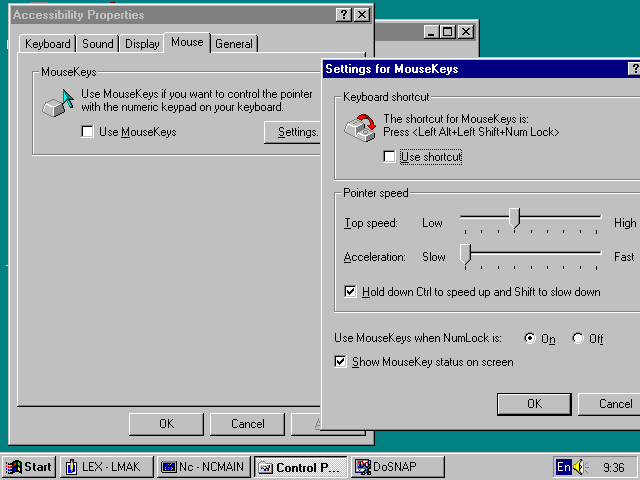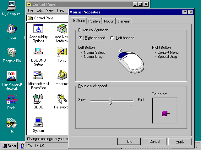 Мышка - самый известный графический манипулятор, поставляемый сейчас с каждым ПК. Мышки служат для перемещения курсора при их перемещении по поверхности стола или специального коврика. Для этого они имеют снизу массивный обрезиненный шарик, вращение которого при перемещении мышки передается двум перпендикулярно расположенным осям, снабженным датчиками углов поворота. Они и создают сигналы перемещения мышки в двух направлениях - вперед и назад, вправо и влево. Мышка имеет от одной до трех кнопок, позволяющих фиксировать какие-либо действия. Для Windows 95 применяются двух- или трехкнопочные мышки. Надо помнить, что у мышки в Windows 95 эффективно используются как левая, так и правая клавиша. Казалось бы, работа с мышкой проста и не требует настройки. Но в литературе был описан анекдотический случай, как одна журналистка, купившая себе портативный ПК, в ответ на вопросы друзей, как ей пришлась по душе покупка, разочарованно отвечала, что все "О'кей!", вот только курсор мышки перемещается довольно быстро. Бедняга не знала, что есть возможность исправить это, а когда ее друзья занялись ликвидацией указанного недостатка, то обнаружили, что скорость перемещения курсора мышки была задана настолько большой, что практически работать с ней было невозможно. Ряд установок для мышки имеется в позиции переключателя Mouse приложения Accessibility Properties - "Рис.70. Диалоговое окно установки параметров работы с мышкой"В диалоговом окне "Рис.70. Диалоговое окно установки параметров работы с мышкой" можно задать не только скорость реакции мышки, но и возможность замены мышки клавишами цифровой группы - возможность, полезная разве что для пользователей-"котов", у которых сам вид мышки вызывает отвращение и желание избавиться от нее. Утилита Mouse в окне контрольной панели открывает дополнительное диалоговое окно с внушительным перечнем (переключателем) опций для работы с мышкой - "Рис.71. Диалоговое окно утилиты Mouse контрольной панели"Сразу видно, что эта утилита позволяет изменять реакцию мышки при "двойном клике" - многие пользователи с трудом осваивают этот "треклятый двойной клик", пытаясь нажимать дважды левую клавишу то слишком быстро, то слишком медленно. Теперь вы можете подстроить реакцию мышки под свою скорость, вместо того чтобы подстраиваться под заданную (впрочем и это не так сложно для здорового пользователя). Можно также поменять функции левой и правой клавиш - что полезно для пользователей-левшей. Теперь, зная, что у мышки можно отрегулировать все, можно надеяться, что пользователи вполне самостоятельно выполнят эти регулировки для других положений переключателя утилиты Mouse контрольной панели.