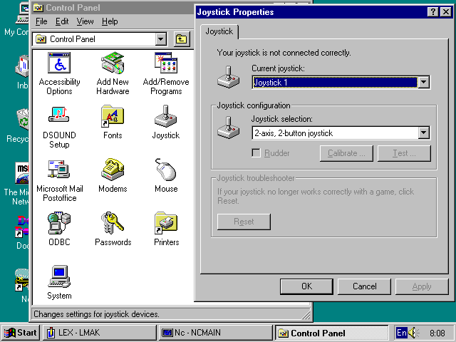 Джойстик, как и мышка, является графическим манипулятором, который служит для перемещения курсора по экрану дисплея или управления теми или иными графическими объектами. Джойстик отличается от мышки лишь конструктивным оформлением - обычно он выполнен в виде рычажка или рукоятки пистолета. Их можно перемещать в любом направлении. Рычажок (ручка) связаны с потенциометрами, которые создают аналоговые сигналы, значения которых определяют координаты курсора. В компьютере контроллер джойстика превращает эти сигналы в цифровые коды и они используются для перемещения курсора. Джойстик обычно имеет массивное основание или подставку с вакуумными присосками, прочно сцепляющимися с гладкой поверхностью стола. Джойстик заметно увеличивает срок службы клавиатуры, особенно у ПК для игровых применений - без него азартные пользователи (как дети, так и старики) могут в месяц-другой разбить клавиатуру. Джойстик имеет по крайней мере одну пусковую кнопку. С ее помощью можно произвести выстрел из "лазерного оружия", "пустить ракету" и т.д. Это особенно удобно в играх, где имитация подобных действий клавиатурой не очень естественна, да и ведет к ее быстрому износу. Некоторые джойстики могут иметь и большее число кнопок. Обычно предусмотрено подключение к ПК двух джойстиков - для вас и вашего соперника по игре. Джойстик пока, в отличие от мышки, не является непременным атрибутом ПК. Впрочем, игровые и мультимедиа-ПК все чаще комплектуются одним и даже двумя джойстиками, дающими большие удобства при работе с играми - точнее сказать, при получении удовольствия от них. Большинство ПК имеют специальные порты и разъемы для подключения джойстиков. Нередко они дублируются и на звуковых картах. Если это так, то лучше сразу отключить такое дублирование во избежание конфликтов между контроллерами джойстиков. Подключаются джойстики к соответствующим разъемам и распознаются при начальной загрузке Windows 95. Для установки опций джойстиков имеется приложение Joystick, значок которого имеется в окне контрольной панели. Его пуск выводит простое диалоговое окно, показанное на "Рис.72. Диалоговое окно установки опций джойстика"Если джойстик подключен, его можно опробовать в работе (протестировать). Можно также определить, правильно ли задан тип джойстика, и установить его.