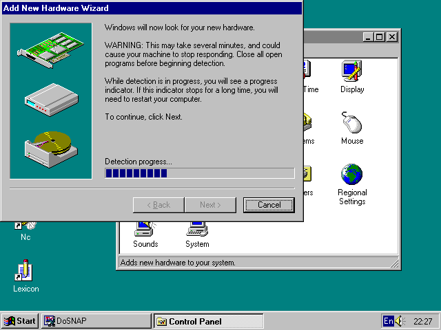 Windows 95 содержит также утилиты для установки и корректировки периферийного оборудования. Их называют Мастерами (Wizards). Работа с мастерами практически аналогична работе с другими утилитами контрольной панели. Мастера имеют диалоговые окна с характерной кнопкой Next (следующий). Нажимая эту кнопку можно последовательно шаг за шагом выполнить нужную работу. Каждый шаг обычно предельно прост, так что даже самые сложные настройки могут выполнять обычные пользователи. На"Рис.73. Работа мастера по установке Hardware" показан в работе Мастер для установки нового периферийного оборудования. Этот Мастер появляется, если запустить утилиту Add New Hardware - установка новых периферийных устройств (их именуют обобщенно как hardware, что среди наших пользователей можно уподобить термину "железо", разумеется, компьютерное). В данном случае мастер проводит довольно длительный просмотр всего подключенного к ПК оборудования. О времени просмотра можно судить по горизонтальной шкале. Возможно, как отмечалось, вам придется по шагам пройти весь цикл установки.